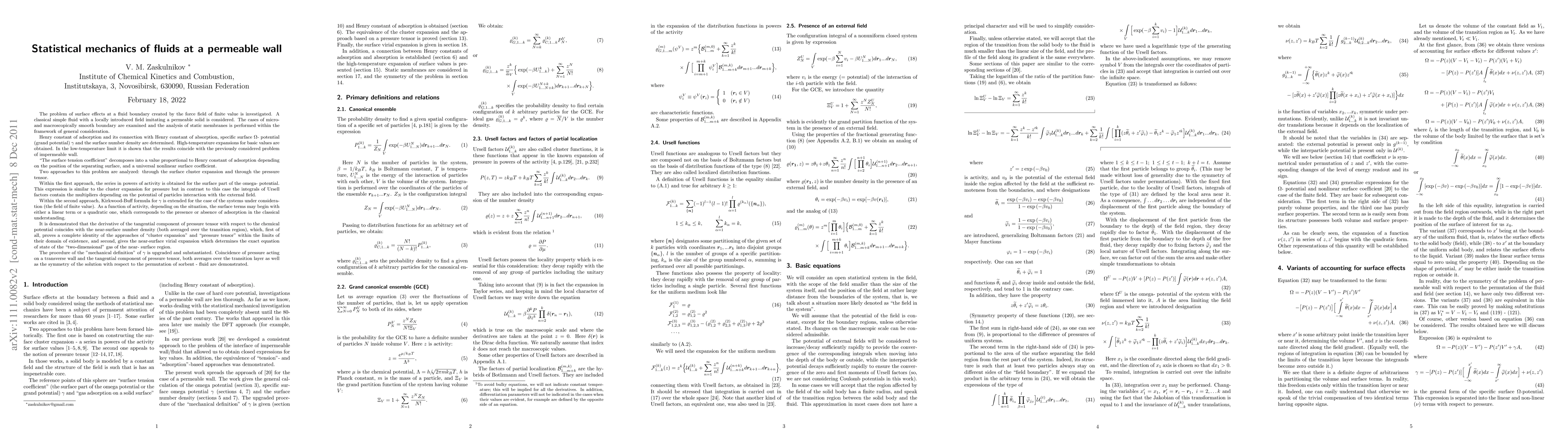 The problem of surface effects at a fluid boundary created by the force field of finite value is investigated. A classical simple fluid with a locally introduced field imitating a permeable solid is considered. The cases of micro- and macroscopically smooth boundary are examined and the analysis of static membranes is performed. Henry constant of adsorption and its connection with Henry constant of absorption, specific surface grand potential (gamma) and the surface number density are determined. High-temperature expansions and low-temperature limit for basic values are obtained. "The surface tension coefficient" decomposes into a value proportional to Henry constant of adsorption depending on the position of the separating surface, and a universal nonlinear surface coefficient. Two approaches to this problem are analyzed: through the surface cluster expansion and through the pressure tensor. Within the first approach, the series in powers of activity is obtained for gamma. This expression is similar to the cluster expansion for pressure but in contrast to this case the integrals of Ursell factors contain the multipliers depending on the potential of particles interaction with the external field. Within the second approach, Kirkwood-Buff formula for gamma is extended for the case of the field of finite value. A complete identity of the approaches of "cluster expansion" and "pressure tensor" is demonstrated, and the near-surface virial expansion which determines the exact equation of state of the "two-dimensional" gas of the near-surface region is constructed. Coincidence of pressure acting on a transverse wall and the tangential component of pressure tensor, both averages over the transition layer as well as the symmetry of the solution with respect to the permutation of sorbent - fluid are demonstrated.