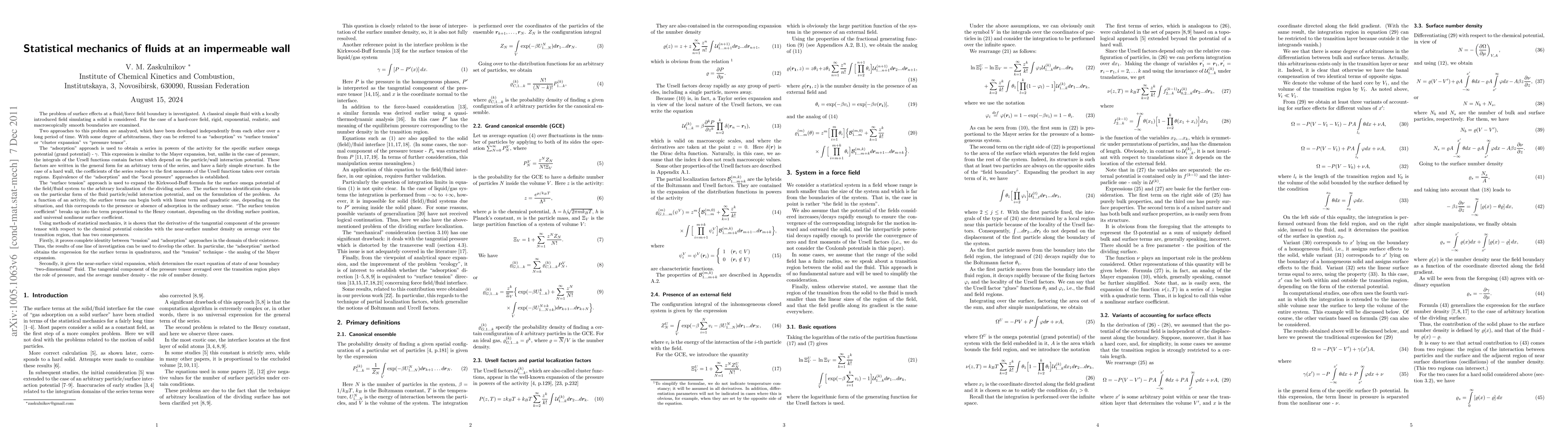 The problem of surface effects at a fluid/force field boundary is investigated. A classical simple fluid with a locally introduced field simulating a solid is considered. For the case of a hard-core field, rigid, exponential, realistic, and macroscopically smooth boundaries are examined. Two approaches to this problem are analyzed. With some degree of arbitrariness, they can be referred to as "adsorption" vs "surface tension" or "cluster expansion" vs "pressure tensor". The "adsorption" approach is used to obtain a series in powers of the activity for gamma. For Mayer-type expansion the integrals of the Ursell functions contain factors which depend on the particle/wall interaction potential. In the case of a hard wall, the coefficients of the series reduce to the first moments of the Ursell functions taken over certain regions. The "surface tension" approach is used to expand the Kirkwood-Buff formula for gamma to the arbitrary localization of the dividing surface. "The surface tension coefficient" breaks up into the term proportional to the Henry constant, depending on the dividing surface position, and universal nonlinear surface coefficient. It is shown that the derivative of the tangential component of the pressure tensor with respect to the chemical potential coincides with the near-surface number density on average over the transition region, that has two consequences. Firstly, it proves complete identity between "tension" and "adsorption" approaches in the domain of their existence. Secondly, it gives the near-surface virial expansion, which determines the exact equation of state of near boundary "two-dimensional" fluid. The tangential component of the pressure tensor averaged over the transition region plays the role of pressure, and the average number density - the role of number density.