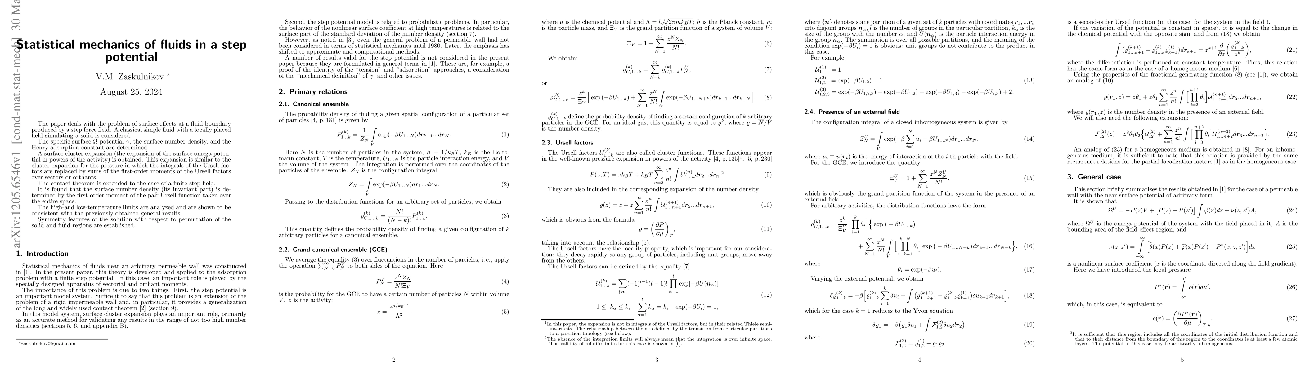The paper deals with the problem of surface effects at a fluid boundary produced by a step force field. A classical simple fluid with a locally placed field simulating a solid is considered. The specific surface Omega-potential gamma, the surface number density, and the Henry adsorption constant are determined. A surface cluster expansion is obtained. It is similar to the cluster expansion for the pressure in which the integrals of the Ursell factors are replaced by sums of the first-order moments of the Ursell factors. The contact theorem is extended to the case of a finite step field. It is found that the surface number density (its invariant part) is determined by the first-order moment of the pair Ursell function taken over the entire space. The high-and low-temperature limits are analyzed and are shown to be consistent with the previously obtained general results.
