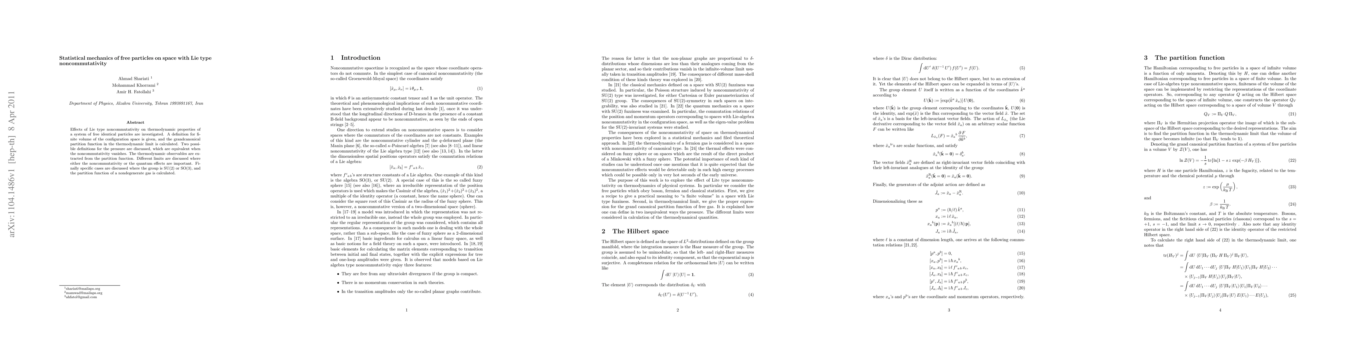 This paper investigates the thermodynamic properties of free particles in a space with Lie type noncommutativity, defining the finite volume of the configuration space and calculating the grandcanonical partition function. It discusses two equivalent pressure definitions and explores thermodynamic observables, concluding with specific cases for SU(2) and SO(3) groups.