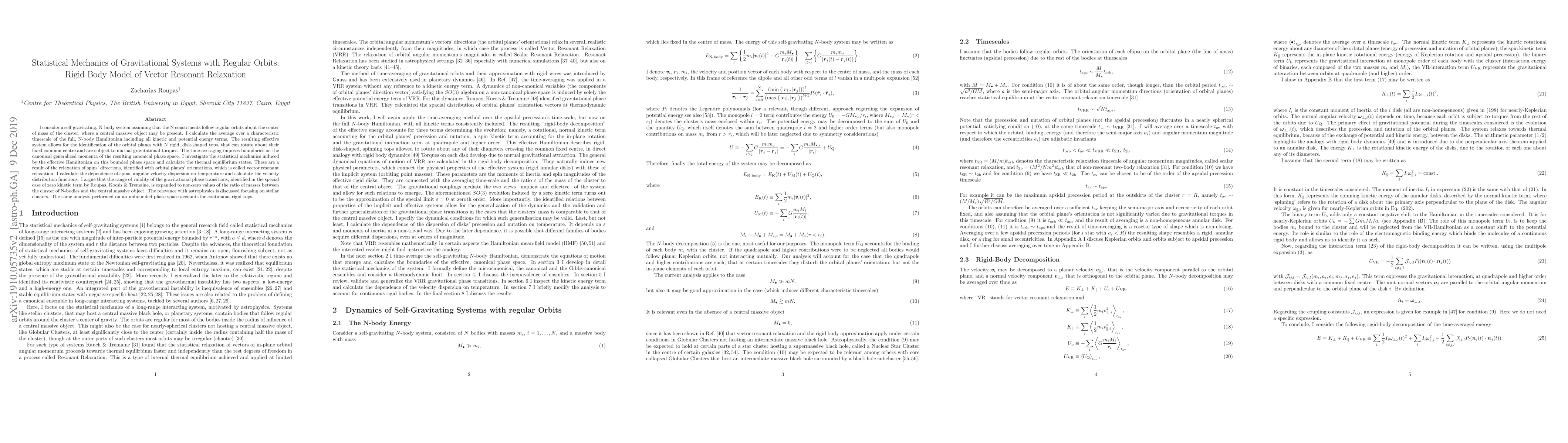 I consider a self-gravitating, N-body system assuming that the N constituents follow regular orbits about the center of mass of the cluster, where a central massive object may be present. I calculate the average over a characteristic timescale of the full, N-body Hamiltonian including all kinetic and potential energy terms. The resulting effective system allows for the identification of the orbital planes with N rigid, disk-shaped tops, that can rotate about their fixed common centre and are subject to mutual gravitational torques. The time-averaging imposes boundaries on the canonical generalized momenta of the resulting canonical phase space. I investigate the statistical mechanics induced by the effective Hamiltonian on this bounded phase space and calculate the thermal equilibrium states. These are a result of the relaxation of spins' directions, identified with orbital planes' orientations, which is called vector resonant relaxation. I calculate the dependence of spins' angular velocity dispersion on temperature and calculate the velocity distribution functions. I argue that the range of validity of the gravitational phase transitions, identified in the special case of zero kinetic term by Roupas, Kocsis & Tremaine, is expanded to non-zero values of the ratio of masses between the cluster of N-bodies and the central massive object. The relevance with astrophysics is discussed focusing on stellar clusters. The same analysis performed on an unbounded phase space accounts for continuous rigid tops.