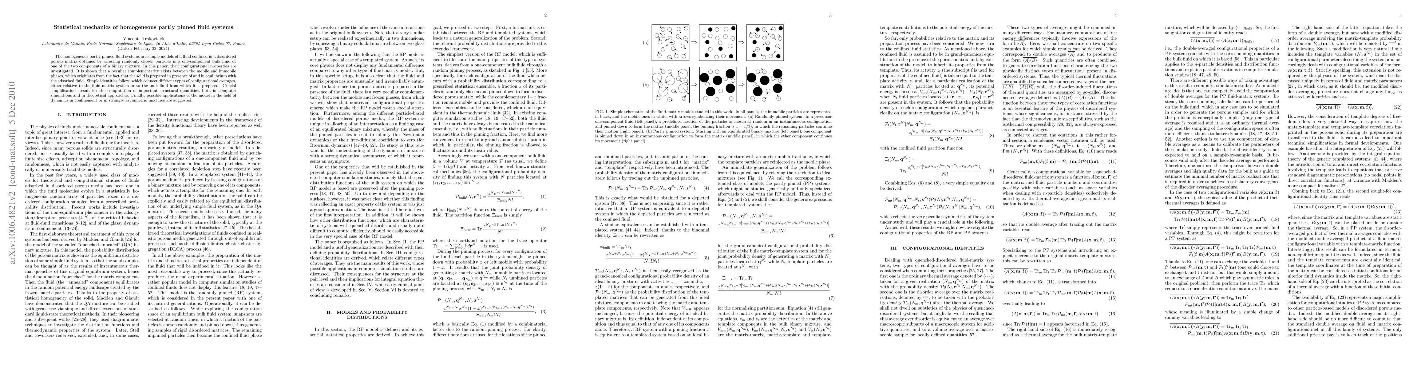 The homogeneous partly pinned fluid systems are simple models of a fluid confined in a disordered porous matrix obtained by arresting randomly chosen particles in a one-component bulk fluid or one of the two components of a binary mixture. In this paper, their configurational properties are investigated. It is shown that a peculiar complementarity exists between the mobile and immobile phases, which originates from the fact that the solid is prepared in presence of and in equilibrium with the adsorbed fluid. Simple identities follow, which connect different types of configurational averages, either relative to the fluid-matrix system or to the bulk fluid from which it is prepared. Crucial simplifications result for the computation of important structural quantities, both in computer simulations and in theoretical approaches. Finally, possible applications of the model in the field of dynamics in confinement or in strongly asymmetric mixtures are suggested.