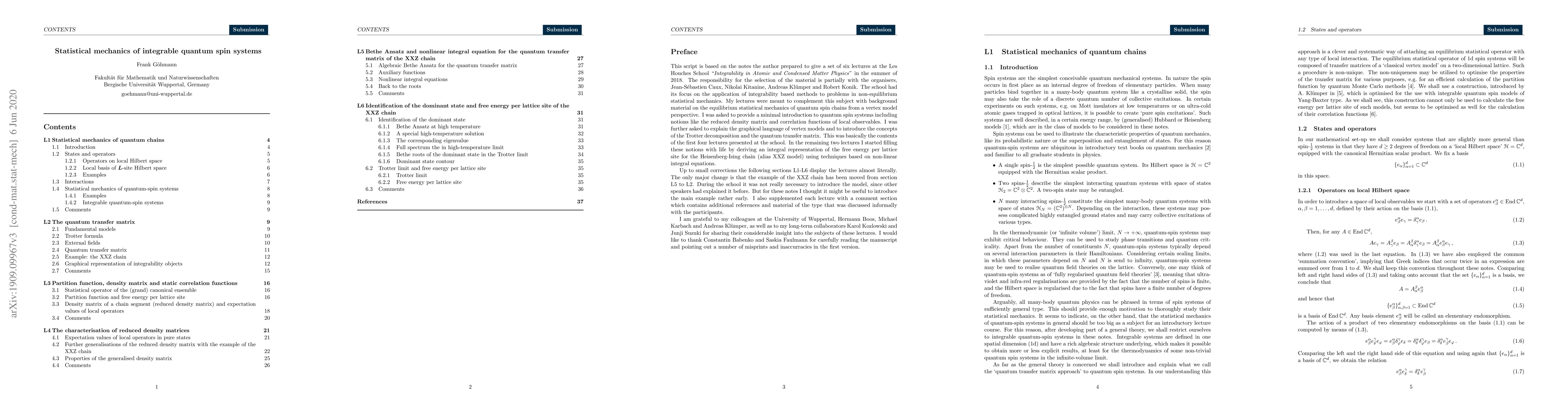This paper provides an introduction to the equilibrium statistical mechanics of integrable quantum spin systems, focusing on vertex models, Trotter decomposition, and quantum transfer matrices. The latter part derives an integral representation of the free energy for the Heisenberg-Ising chain using non-linear integral equations.