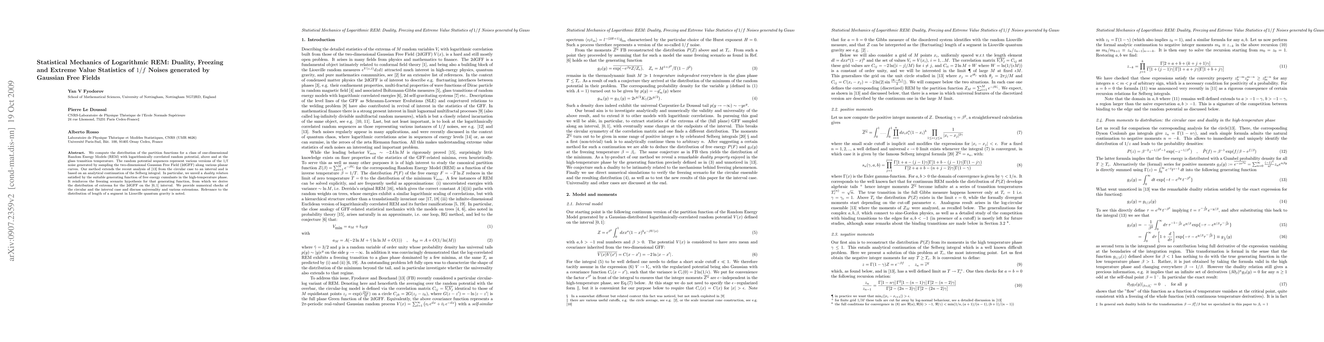 We compute the distribution of the partition functions for a class of one-dimensional Random Energy Models (REM) with logarithmically correlated random potential, above and at the glass transition temperature. The random potential sequences represent various versions of the 1/f noise generated by sampling the two-dimensional Gaussian Free Field (2dGFF) along various planar curves. Our method extends the recent analysis of Fyodorov Bouchaud from the circular case to an interval and is based on an analytical continuation of the Selberg integral. In particular, we unveil a {\it duality relation} satisfied by the suitable generating function of free energy cumulants in the high-temperature phase. It reinforces the freezing scenario hypothesis for that generating function, from which we derive the distribution of extrema for the 2dGFF on the $[0,1]$ interval. We provide numerical checks of the circular and the interval case and discuss universality and various extensions. Relevance to the distribution of length of a segment in Liouville quantum gravity is noted.