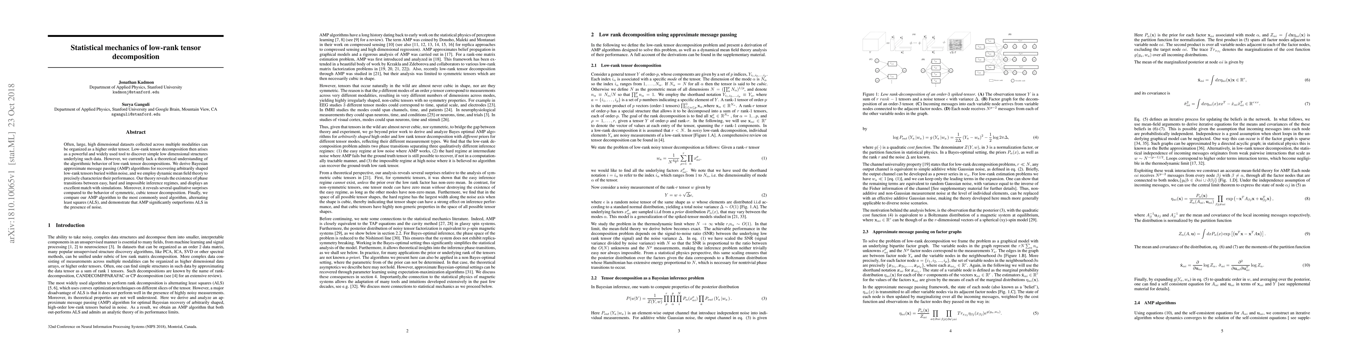 Often, large, high dimensional datasets collected across multiple modalities can be organized as a higher order tensor. Low-rank tensor decomposition then arises as a powerful and widely used tool to discover simple low dimensional structures underlying such data. However, we currently lack a theoretical understanding of the algorithmic behavior of low-rank tensor decompositions. We derive Bayesian approximate message passing (AMP) algorithms for recovering arbitrarily shaped low-rank tensors buried within noise, and we employ dynamic mean field theory to precisely characterize their performance. Our theory reveals the existence of phase transitions between easy, hard and impossible inference regimes, and displays an excellent match with simulations. Moreover, it reveals several qualitative surprises compared to the behavior of symmetric, cubic tensor decomposition. Finally, we compare our AMP algorithm to the most commonly used algorithm, alternating least squares (ALS), and demonstrate that AMP significantly outperforms ALS in the presence of noise.