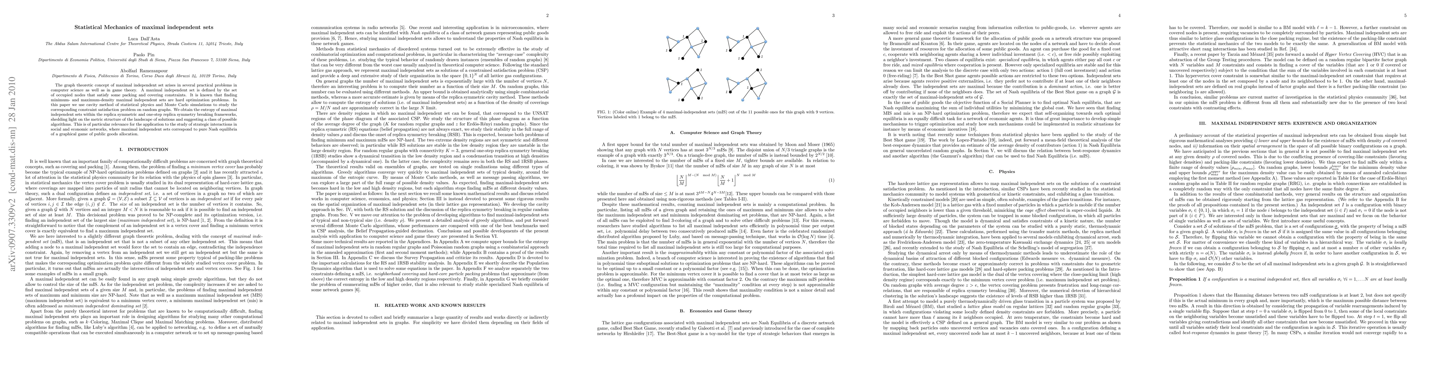 This paper employs statistical mechanics techniques to analyze maximal independent sets in random graphs, using the cavity method and Monte Carlo simulations. It provides insights into the entropy and structure of solution landscapes, relevant for understanding strategic interactions in social and economic networks.