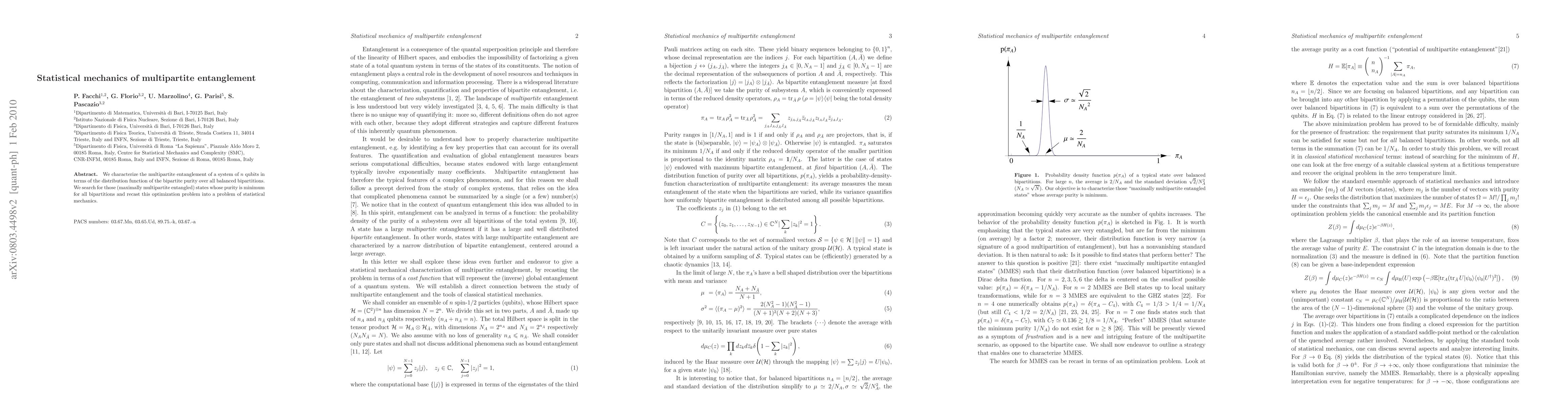 This paper explores the statistical mechanics of multipartite entanglement in n-qubit systems by analyzing the distribution of bipartite purity across all balanced bipartitions. It identifies maximally entangled states with minimal purity for all bipartitions and reformulates the optimization problem as a statistical mechanics issue.