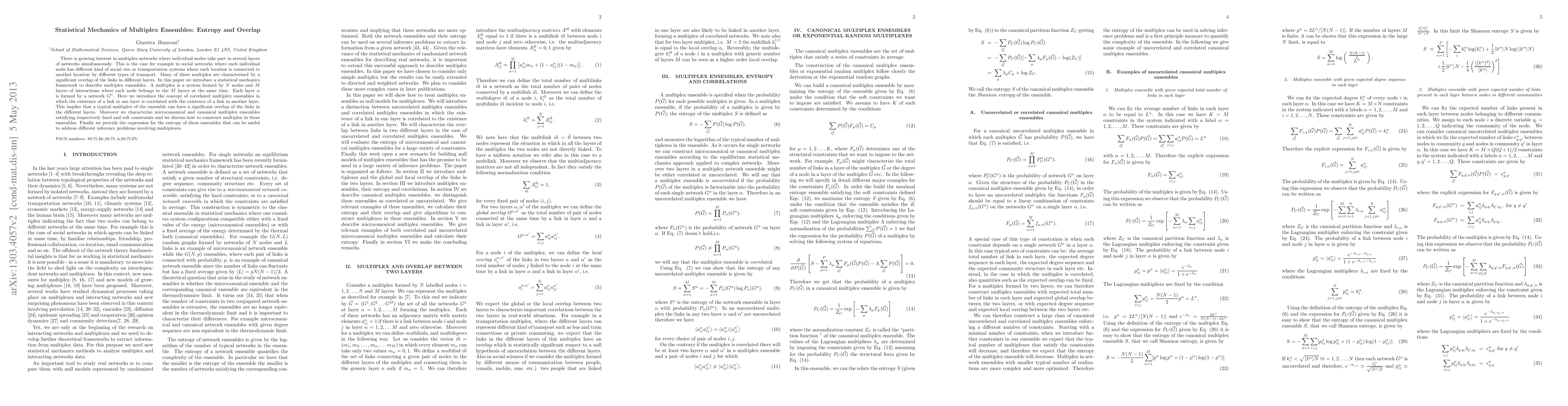 The paper introduces a statistical mechanics framework for multiplex ensembles, characterizing both microcanonical and canonical ensembles with hard and soft constraints, respectively. It provides expressions for the entropy of these ensembles, useful for inference problems involving multiplexes.