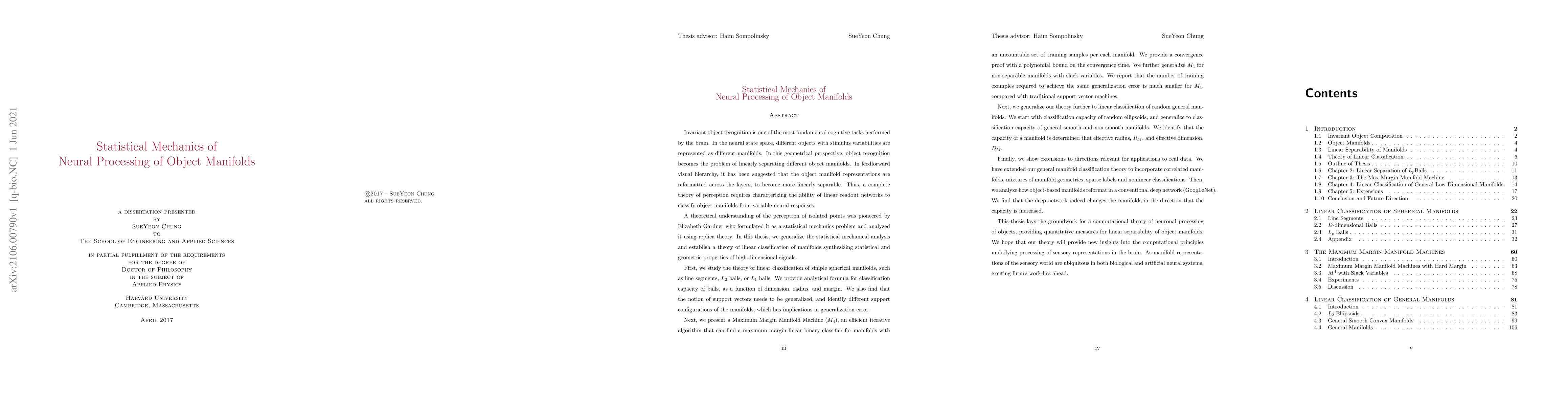 This research develops a statistical mechanics framework to understand how neural networks classify object manifolds, focusing on their linear separability. It extends Gardner's theory to analyze the effective radius and dimension of manifolds, and applies it to deep networks, providing insights into the computational principles of sensory processing in both biological and artificial systems.