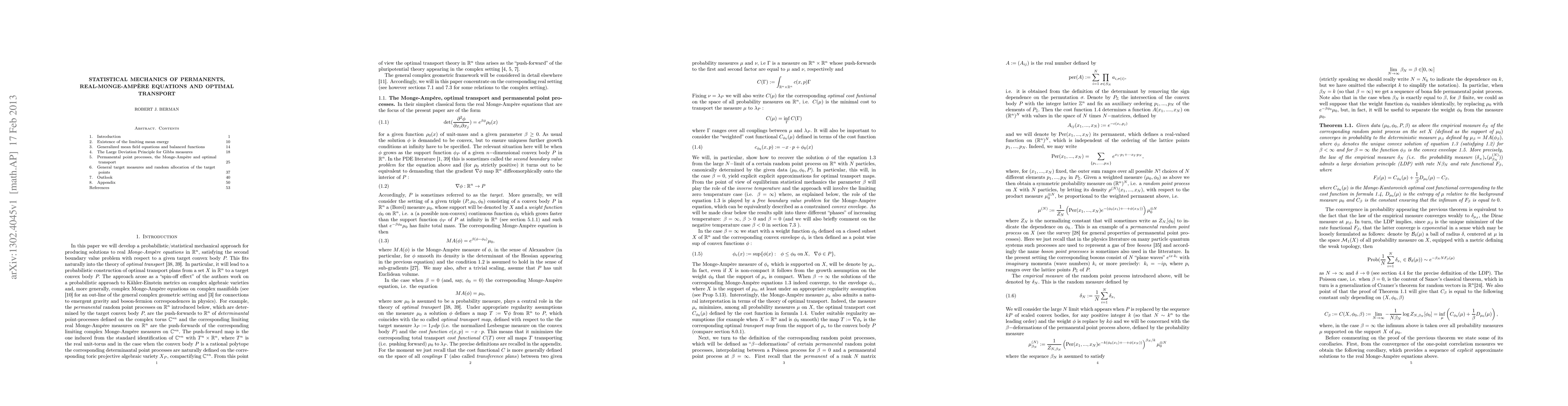 We give a new probabilistic construction of solutions to real Monge-Amp\`ere equations in R^n satisfying the second boundary value problem with respect to a given target convex body P) which fits naturally into the theory of optimal transport. More precisely, certain beta-deformed permanental (bosonic) N-particle point processes are introduced and their empirical measures are, in the large N-limit, shown to converge exponentially in probability to a deterministic measure whose potential satisfies the real Monge-Amp\`ere equation in question. In particular, this allows us to represent the solution as a limit, as N tends to infinity of explicit integrals over the N-fold products of R^n and it also leads to explicit limit formulas for optimal transport maps to the convex body P. Connections to the study of K\"ahler-Einstein metrics on complex algebraic varieties, and in particular toric ones, are briefly discussed.