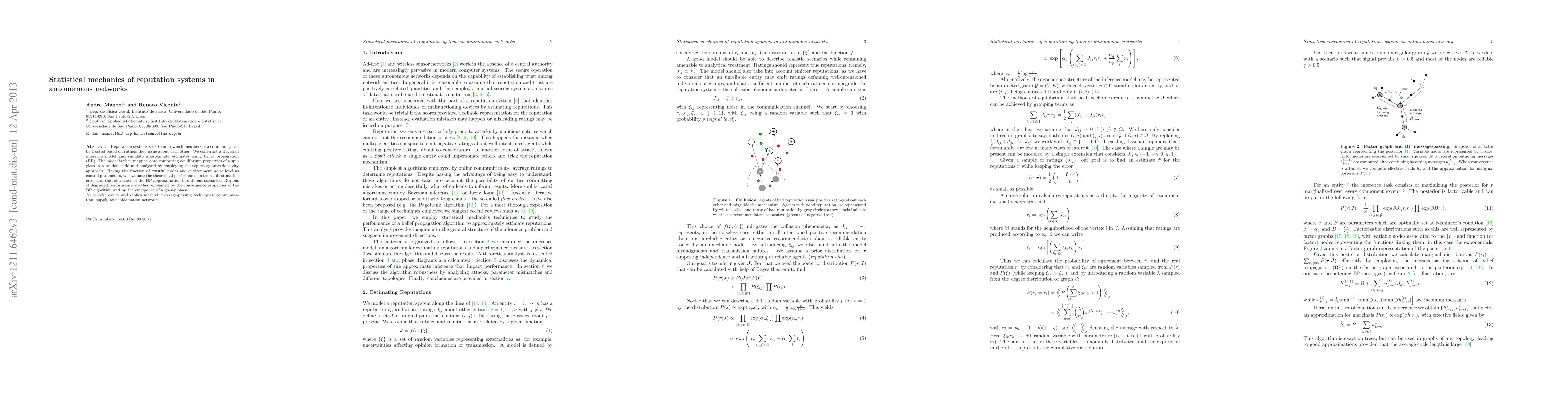 Reputation systems seek to infer which members of a community can be trusted based on ratings they issue about each other. We construct a Bayesian inference model and simulate approximate estimates using belief propagation (BP). The model is then mapped onto computing equilibrium properties of a spin glass in a random field and analyzed by employing the replica symmetric cavity approach. Having the fraction of trustful nodes and environment noise level as control parameters, we evaluate the theoretical performance in terms of estimation error and the robustness of the BP approximation in different scenarios. Regions of degraded performance are then explained by the convergence properties of the BP algorithm and by the emergence of a glassy phase.