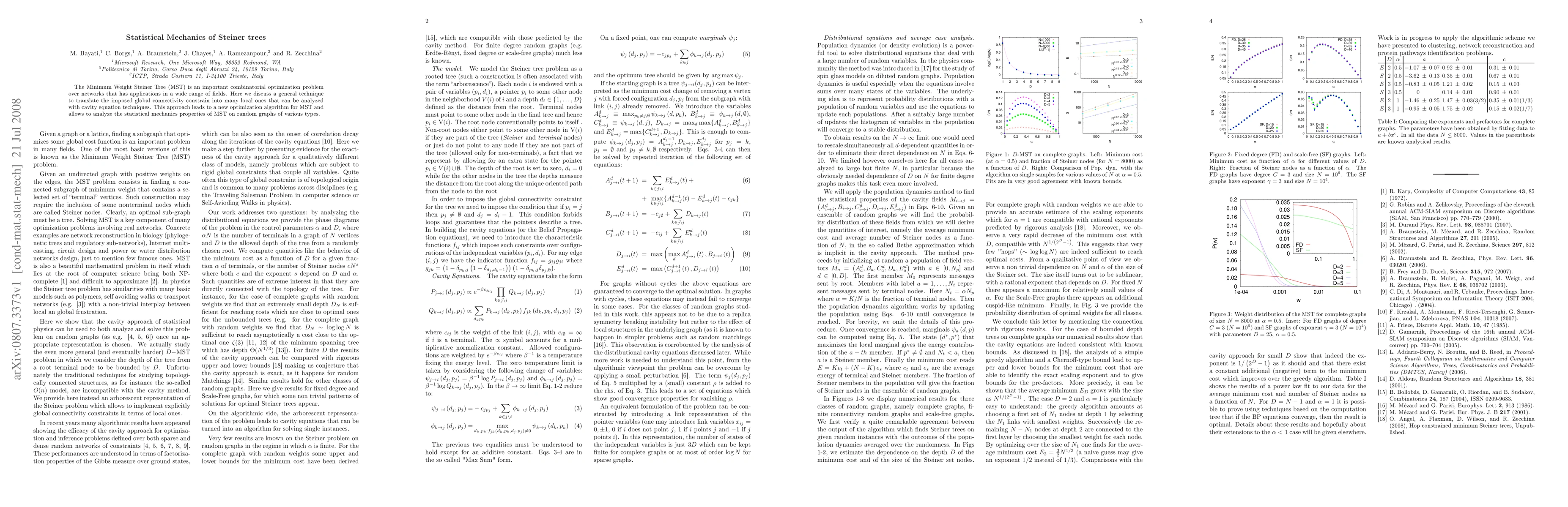 The Minimum Weight Steiner Tree (MST) is an important combinatorial optimization problem over networks that has applications in a wide range of fields. Here we discuss a general technique to translate the imposed global connectivity constrain into many local ones that can be analyzed with cavity equation techniques. This approach leads to a new optimization algorithm for MST and allows to analyze the statistical mechanics properties of MST on random graphs of various types.