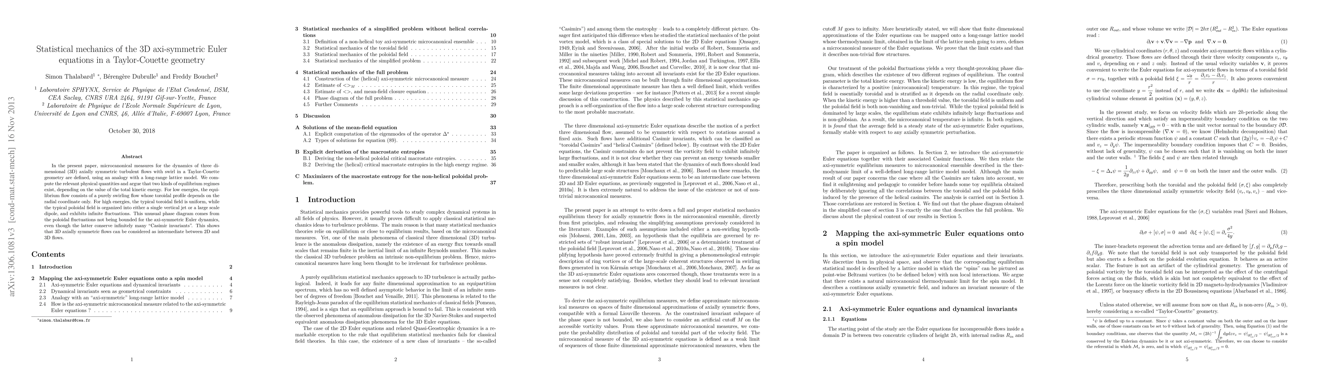 In the present paper, microcanonical measures for the dynamics of three dimensional (3D) axially symmetric turbulent flows with swirl in a Taylor-Couette geometry are defined, using an analogy with a long-range lattice model. We compute the relevant physical quantities and argue that two kinds of equilibrium regimes exist, depending on the value of the total kinetic energy. For low energies, the equilibrium flow consists of a purely swirling flow whose toroidal profile depends on the radial coordinate only. For high energies, the typical toroidal field is uniform, while the typical poloidal field is organized into either a single vertical jet or a large scale dipole, and exhibits infinite fluctuations. This unusual phase diagram comes from the poloidal fluctuations not being bounded for the axi-symmetric Euler dynamics, even though the latter conserve infinitely many ''Casimir invariants''. This shows that 3D axially symmetric flows can be considered as intermediate between 2D and 3D flows.
