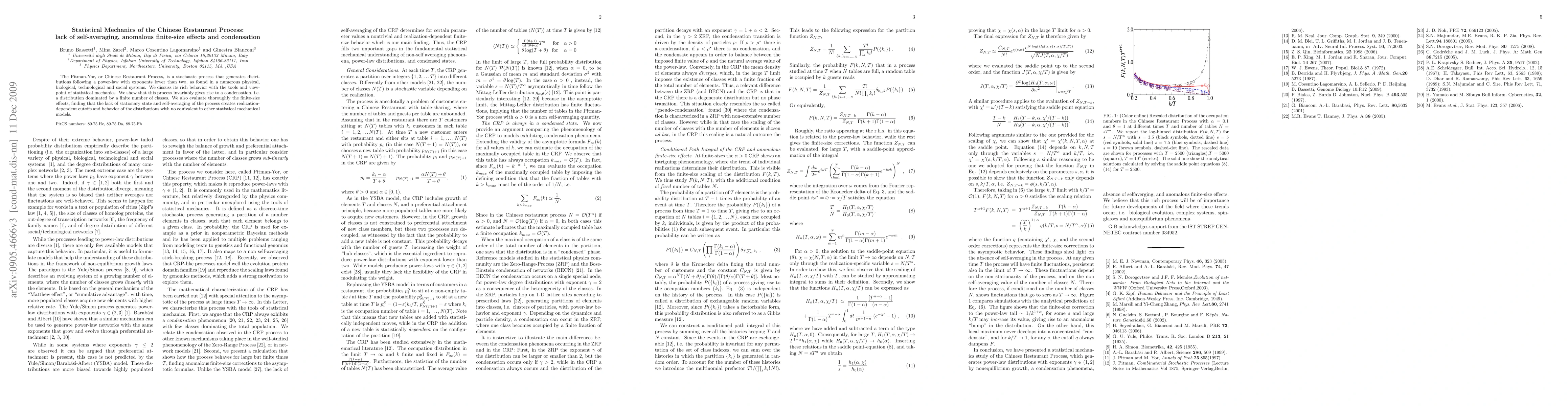 The Chinese Restaurant Process generates power-law distributions and exhibits condensation, where a few classes dominate. It lacks self-averaging and stationary states, leading to realization-dependent cutoffs and anomalous finite-size effects.