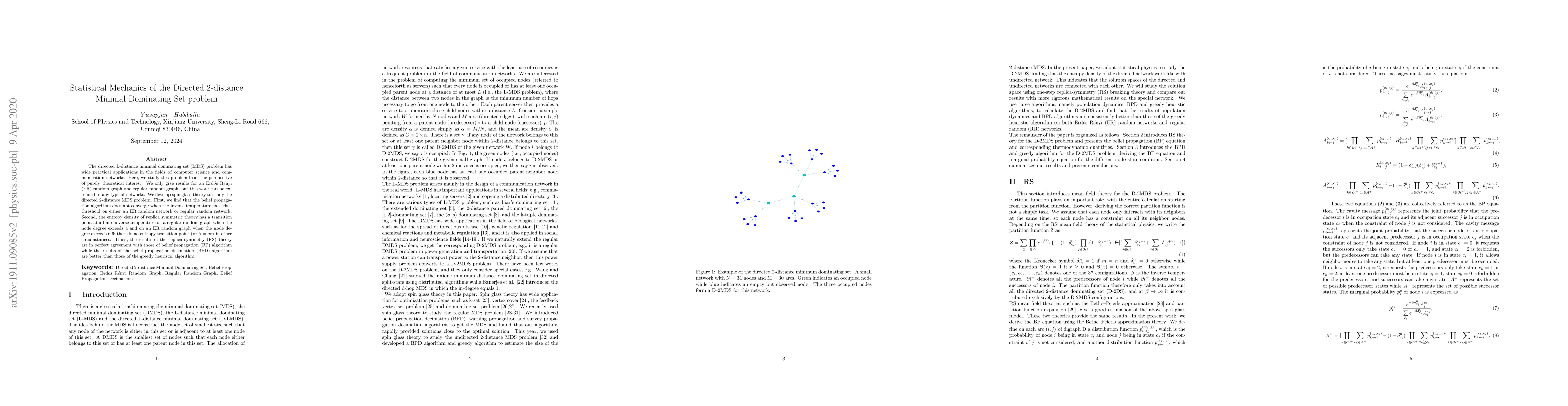 This paper investigates the statistical mechanics of the directed 2-distance minimal dominating set problem using spin glass theory on Erdős–Rényi and regular random graphs. It finds that belief propagation fails to converge beyond a certain temperature threshold and identifies entropy transitions linked to node degrees and graph types.