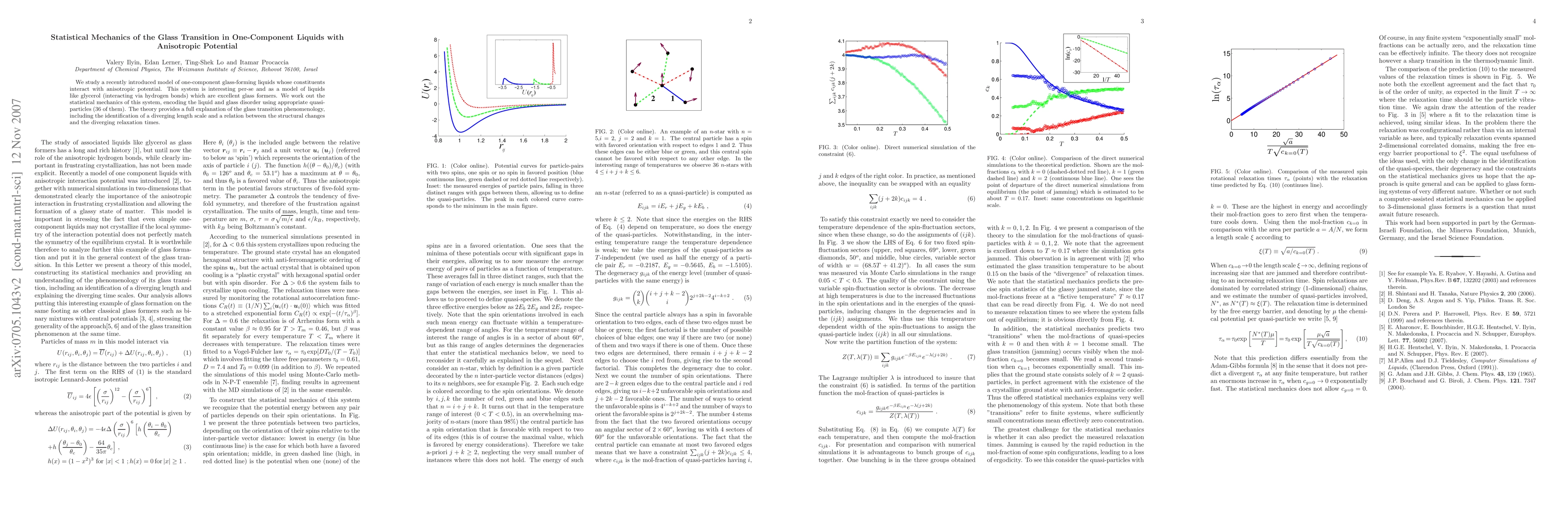 This paper explores a model of one-component glass-forming liquids with anisotropic interactions, using quasi-particles to describe the liquid and glass disorder. The statistical mechanics framework elucidates the glass transition, identifying a diverging length scale and linking structural changes to relaxation times.