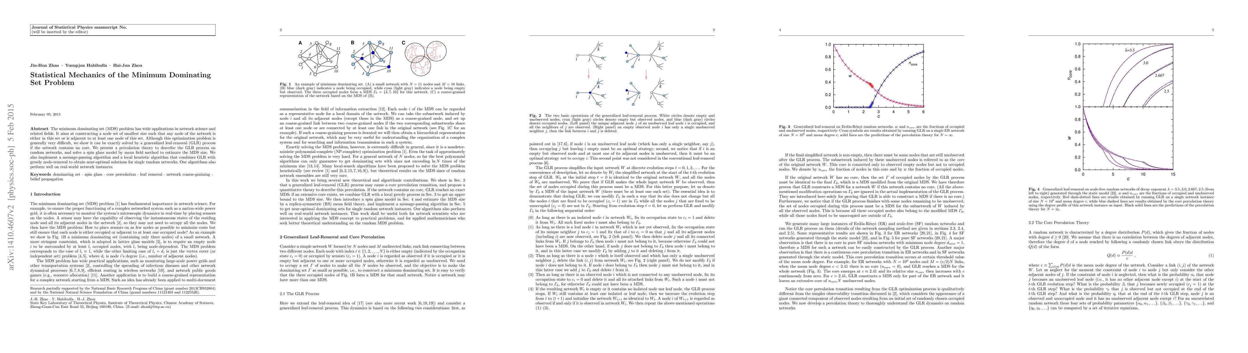 The paper introduces a core percolation theory and a replica-symmetric mean-field theory for the minimum dominating set problem, along with two heuristic algorithms: a GLR-Impact local algorithm and a BPD message-passing algorithm.
