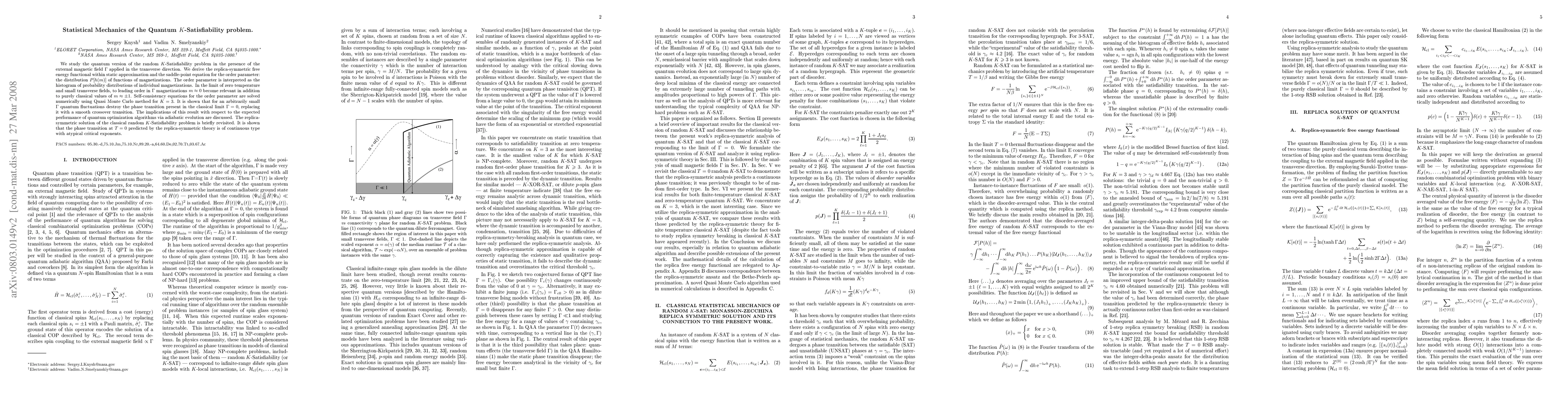 We study the quantum version of the random $K$-Satisfiability problem in the presence of the external magnetic field $\Gamma$ applied in the transverse direction. We derive the replica-symmetric free energy functional within static approximation and the saddle-point equation for the order parameter: the distribution $P[h(m)]$ of functions of magnetizations. The order parameter is interpreted as the histogram of probability distributions of individual magnetizations. In the limit of zero temperature and small transverse fields, to leading order in $\Gamma$ magnetizations $m \approx 0$ become relevant in addition to purely classical values of $m \approx \pm 1$. Self-consistency equations for the order parameter are solved numerically using Quasi Monte Carlo method for K=3. It is shown that for an arbitrarily small $\Gamma$ quantum fluctuations destroy the phase transition present in the classical limit $\Gamma=0$, replacing it with a smooth crossover transition. The implications of this result with respect to the expected performance of quantum optimization algorithms via adiabatic evolution are discussed. The replica-symmetric solution of the classical random $K$-Satisfiability problem is briefly revisited. It is shown that the phase transition at T=0 predicted by the replica-symmetric theory is of continuous type with atypical critical exponents.