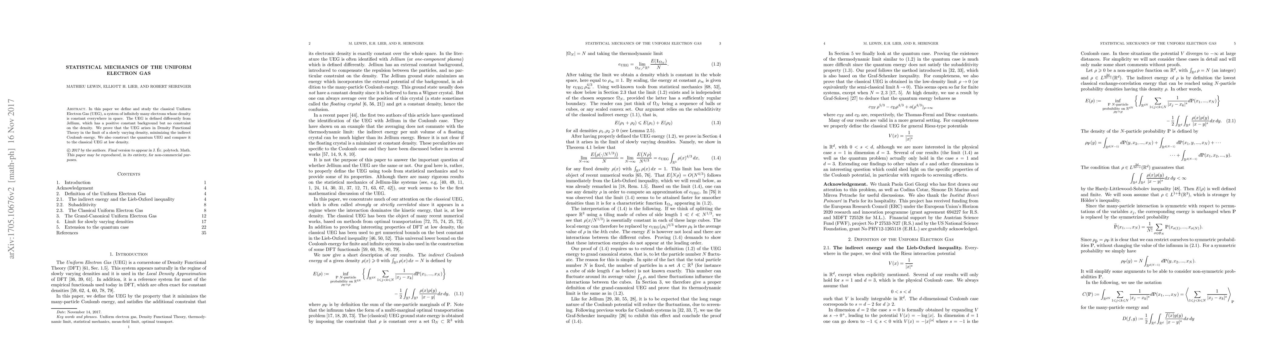 In this paper we define and study the classical Uniform Electron Gas (UEG), a system of infinitely many electrons whose density is constant everywhere in space. The UEG is defined differently from Jellium, which has a positive constant background but no constraint on the density. We prove that the UEG arises in Density Functional Theory in the limit of a slowly varying density, minimizing the indirect Coulomb energy. We also construct the quantum UEG and compare it to the classical UEG at low density.