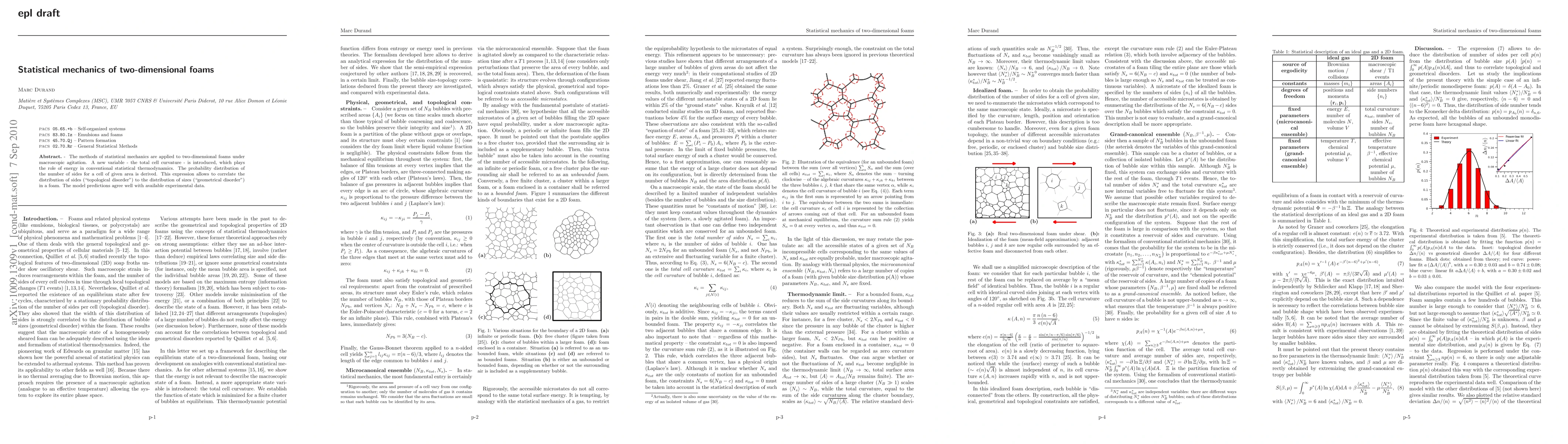 This paper applies statistical mechanics to two-dimensional foams, introducing total cell curvature as a new energy variable. It derives the probability distribution linking cell side count and area, correlating topological and geometrical disorder, and finds good agreement with experimental data.