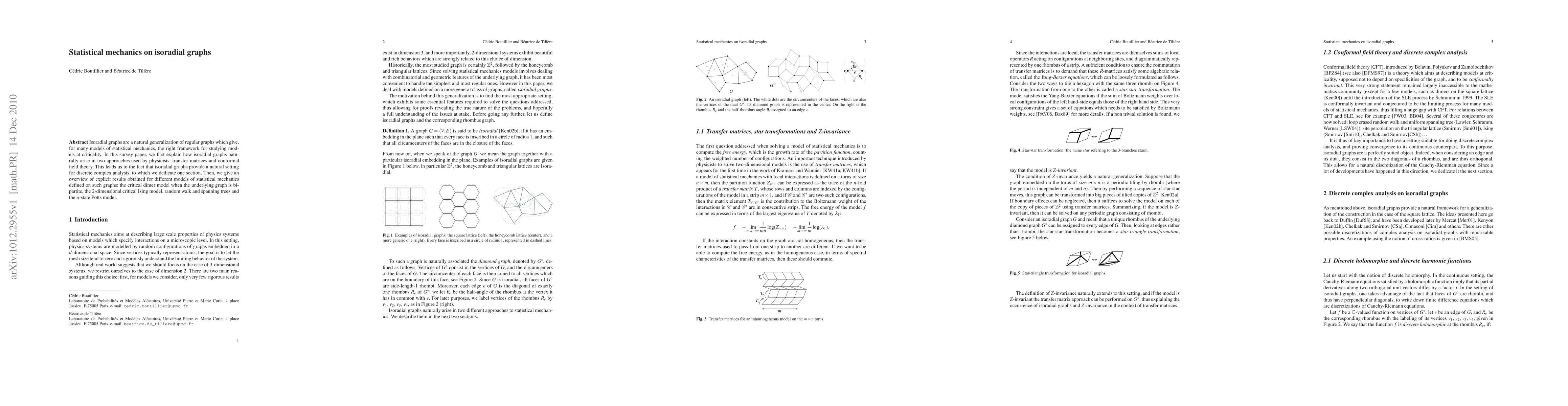 This paper surveys statistical mechanics on isoradial graphs, showing their emergence in transfer matrices and conformal field theory. It explores their role in discrete complex analysis and reviews explicit results for various statistical mechanics models including the critical dimer model, 2D Ising model, random walks, spanning trees, and the q-state Potts model.