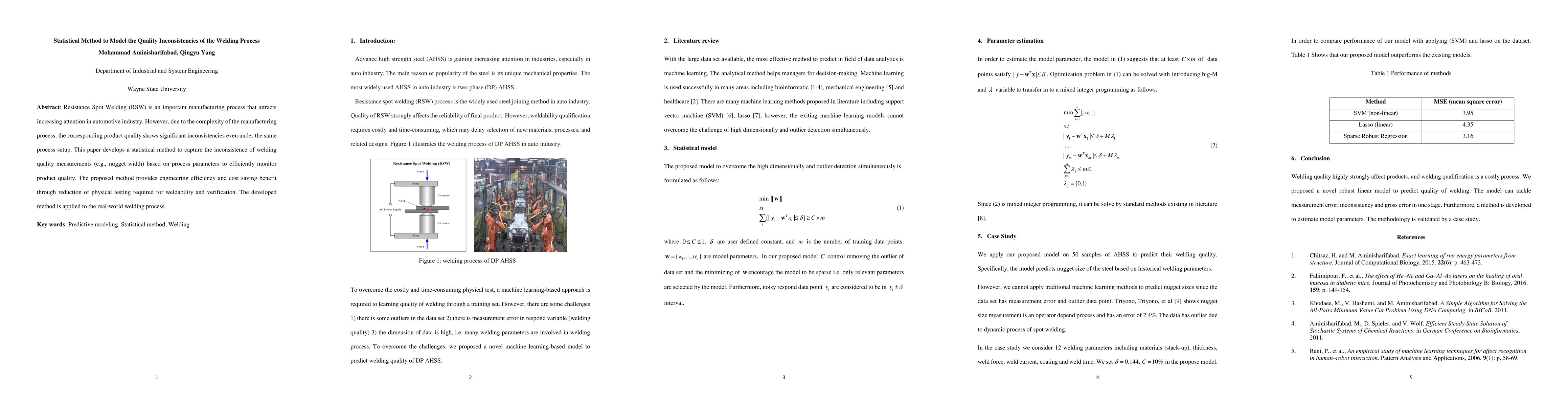 This paper proposes a statistical method to model the quality inconsistencies in Resistance Spot Welding (RSW) by analyzing process parameters, aiming to improve monitoring efficiency and reduce physical testing. The method is applied to real-world welding processes, offering engineering efficiency and cost savings.