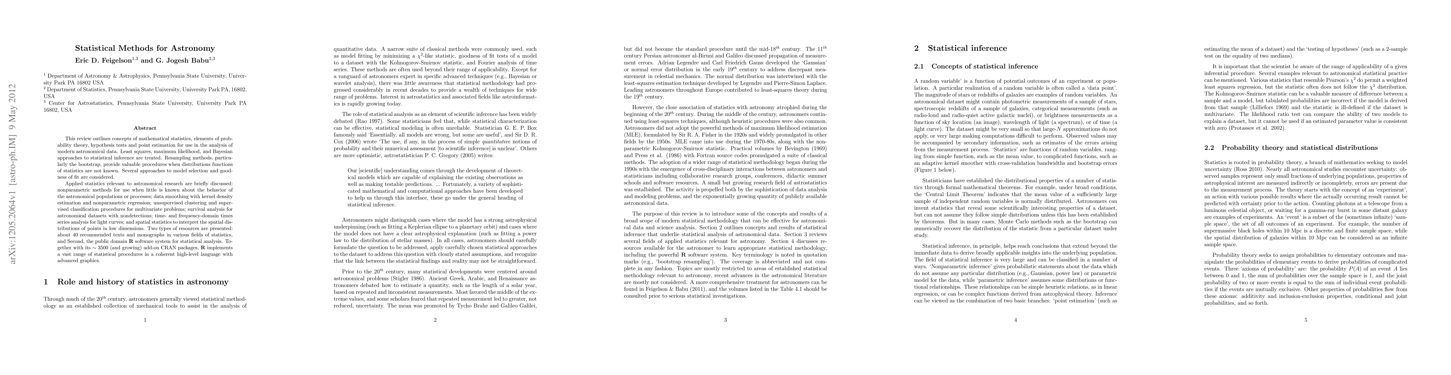 This review covers statistical methods for analyzing modern astronomical data, including least squares, maximum likelihood, and Bayesian inference, with a focus on resampling techniques like the bootstrap. It also discusses applied statistics relevant to astronomy, such as nonparametric methods, data smoothing, clustering, and time-series analysis, and recommends resources like R software for statistical analysis.