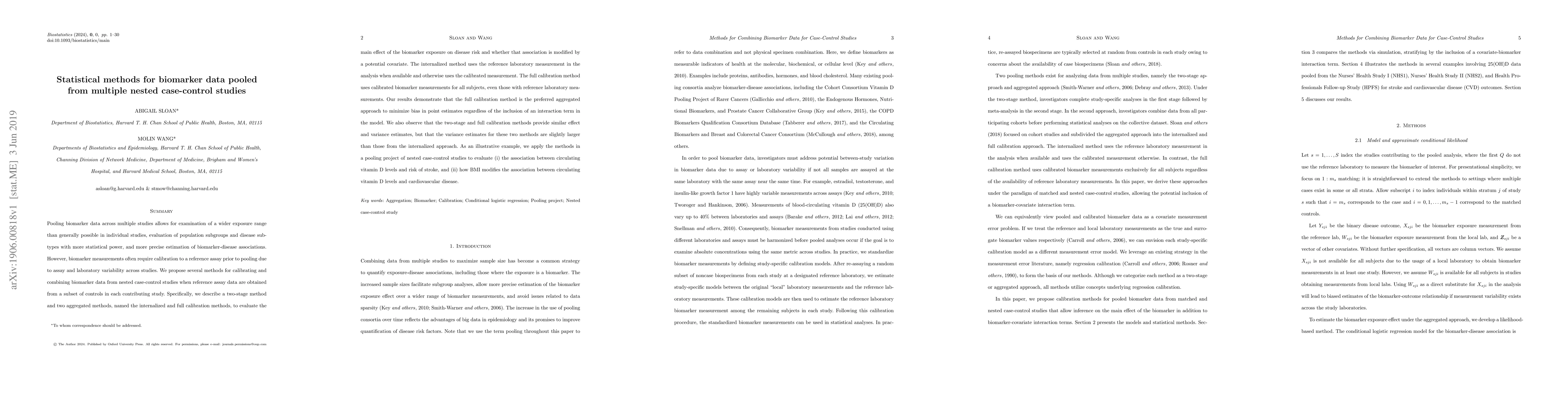 This paper proposes statistical methods for calibrating and combining biomarker data from multiple nested case-control studies, emphasizing the full calibration method as the preferred approach to minimize bias in estimating biomarker-disease associations. The study applies these methods to evaluate the association between vitamin D levels and stroke risk, and how BMI modifies this relationship.
