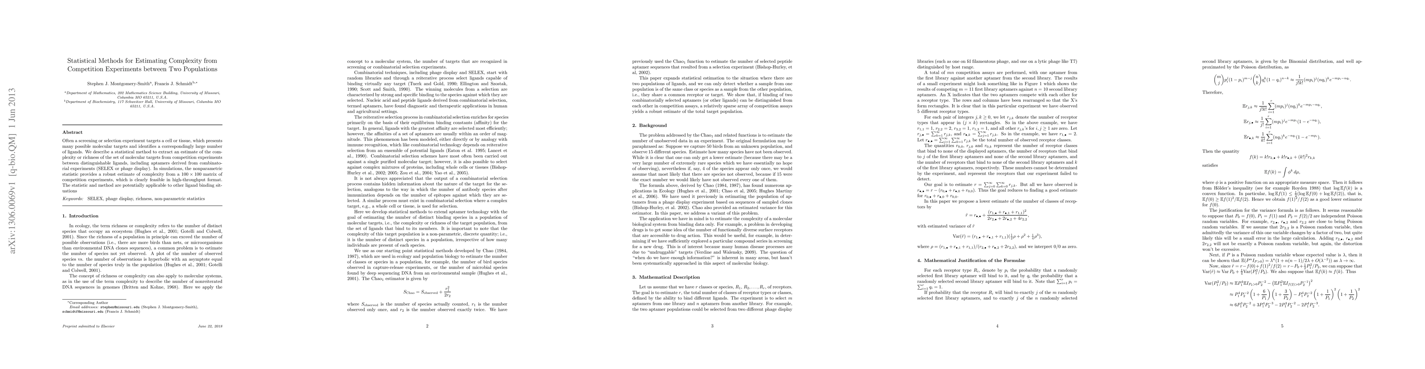 Often a screening or selection experiment targets a cell or tissue, which presents many possible molecular targets and identifies a correspondingly large number of ligands. We describe a statistical method to extract an estimate of the complexity or richness of the set of molecular targets from competition experiments between distinguishable ligands, including aptamers derived from combinatorial experiments (SELEX or phage display). In simulations, the nonparametric statistic provides a robust estimate of complexity from a 100x100 matrix of competition experiments, which is clearly feasible in high-throughput format. The statistic and method are potentially applicable to other ligand binding situations.