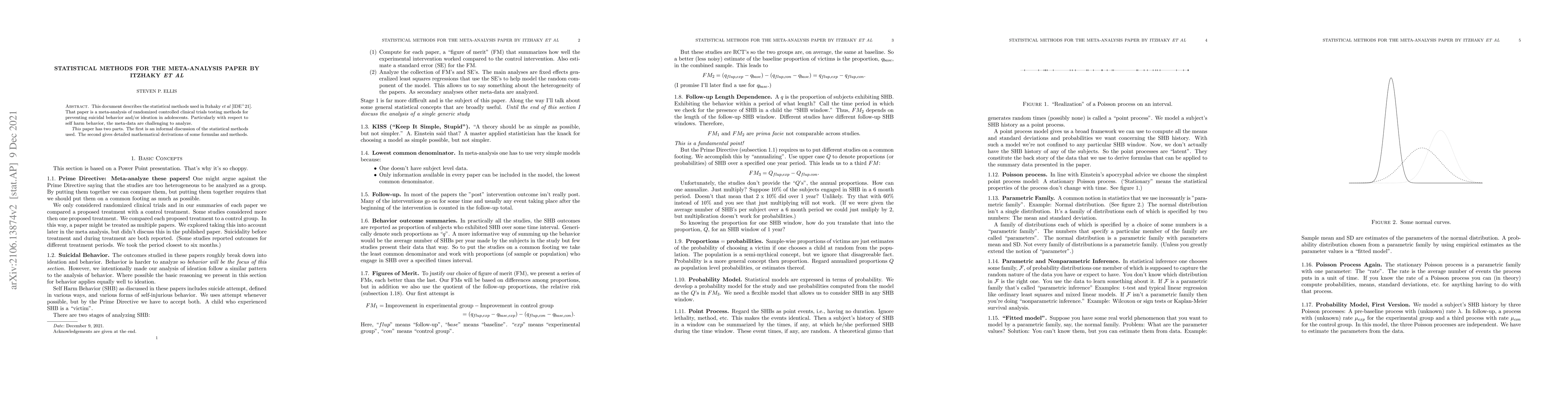 This document describes the statistical methods used in Itzhaky et al ("Systematic Review and Meta-analysis: Twenty-six Years of Randomized Clinical Trials of Psychosocial Interventions to Reduce Suicide Risk in Adolescents"). That paper is a meta-analysis of randomized controlled clinical trials testing methods for preventing suicidal behavior and/or ideation in youth. Particularly on the behavior side the meta-data are challenging to analyze. This paper has two parts. The first is an informal discussion of the statistical methods used. The second gives detailed mathematical derivations of some formulas and methods.