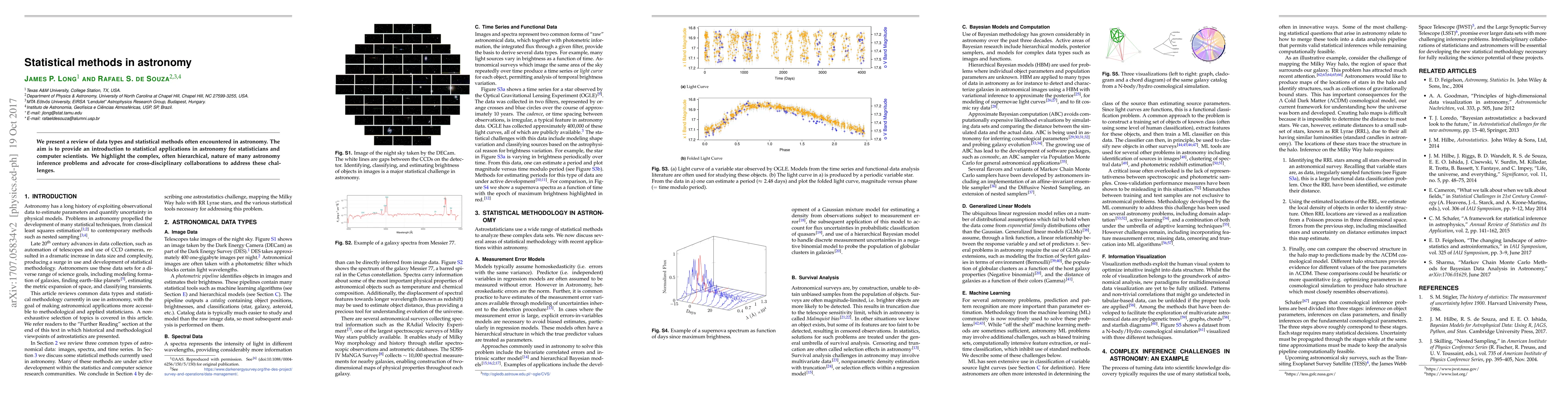 This paper reviews statistical methods and data types in astronomy, aiming to introduce these applications to statisticians and computer scientists. It emphasizes the complexity of hierarchical inference problems in astronomy and calls for interdisciplinary collaborations to tackle these challenges.
