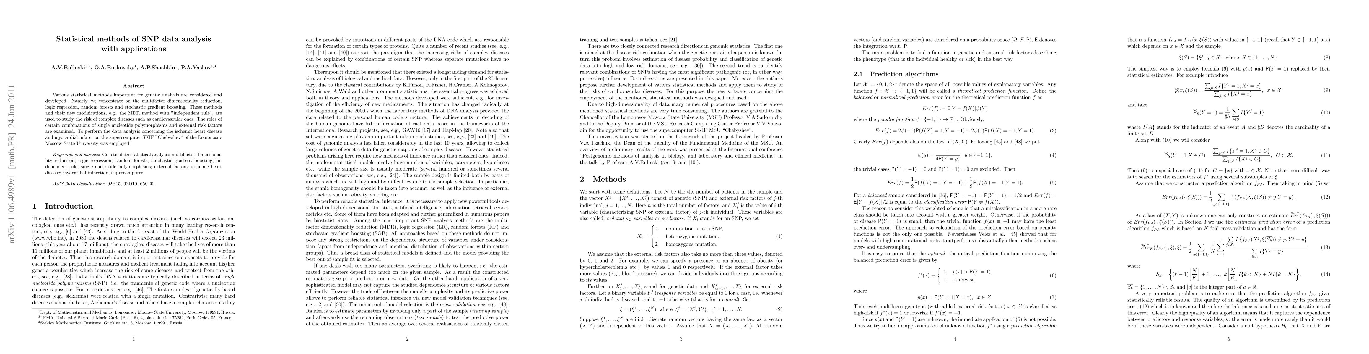 Various statistical methods important for genetic analysis are considered and developed. Namely, we concentrate on the multifactor dimensionality reduction, logic regression, random forests and stochastic gradient boosting. These methods and their new modifications, e.g., the MDR method with "independent rule", are used to study the risk of complex diseases such as cardiovascular ones. The roles of certain combinations of single nucleotide polymorphisms and external risk factors are examined. To perform the data analysis concerning the ischemic heart disease and myocardial infarction the supercomputer SKIF "Chebyshev" of the Lomonosov Moscow State University was employed.