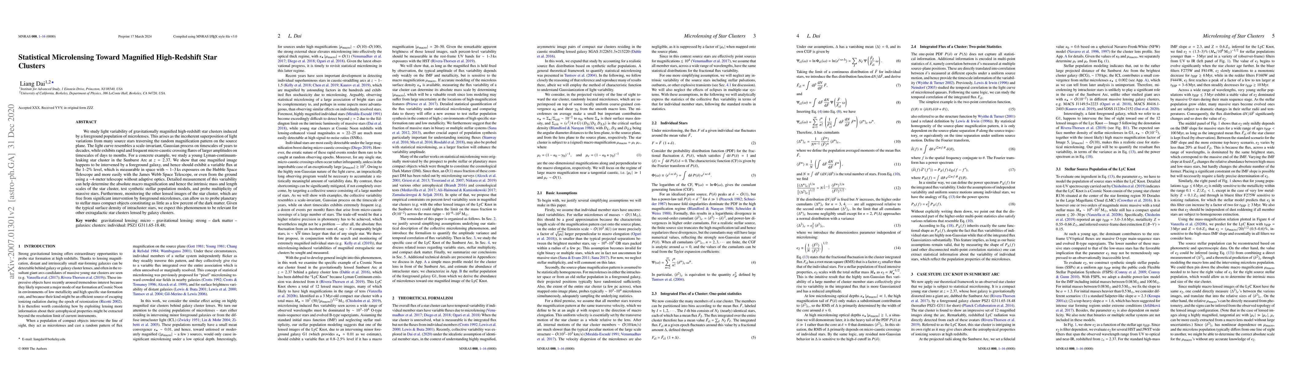 This paper investigates the light variability of gravitationally magnified high-redshift star clusters due to foreground microlenses, revealing a scale-invariant Gaussian process over long timescales and rapid flares on shorter ones. The study focuses on a specific star cluster in the Sunburst Arc, suggesting that its variability can be measured with current space telescopes, enabling insights into the cluster's mass, stellar population models, and the presence of compact objects in dark matter.