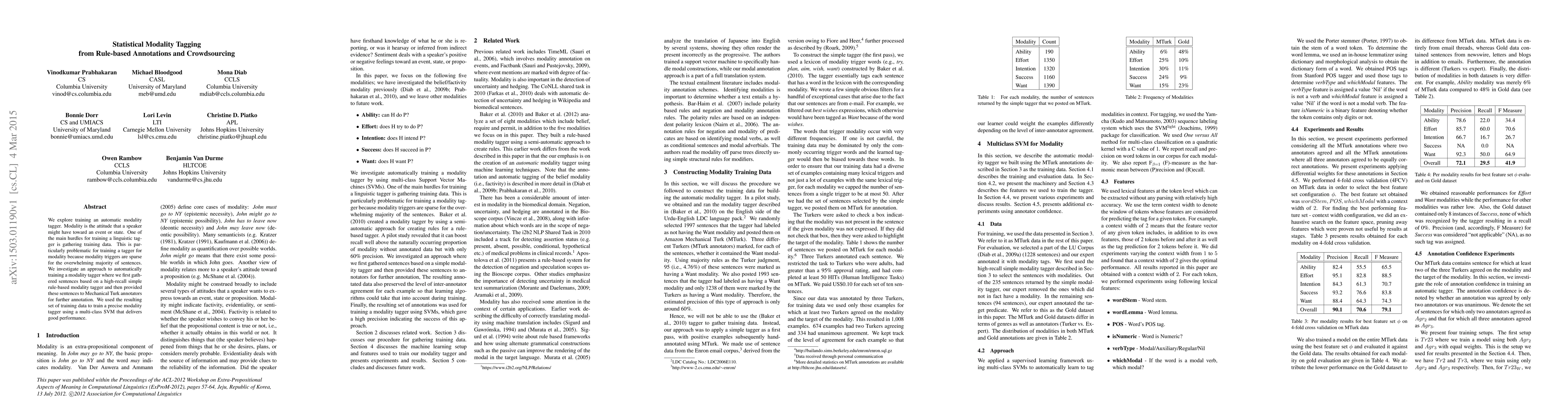 We explore training an automatic modality tagger. Modality is the attitude that a speaker might have toward an event or state. One of the main hurdles for training a linguistic tagger is gathering training data. This is particularly problematic for training a tagger for modality because modality triggers are sparse for the overwhelming majority of sentences. We investigate an approach to automatically training a modality tagger where we first gathered sentences based on a high-recall simple rule-based modality tagger and then provided these sentences to Mechanical Turk annotators for further annotation. We used the resulting set of training data to train a precise modality tagger using a multi-class SVM that delivers good performance.