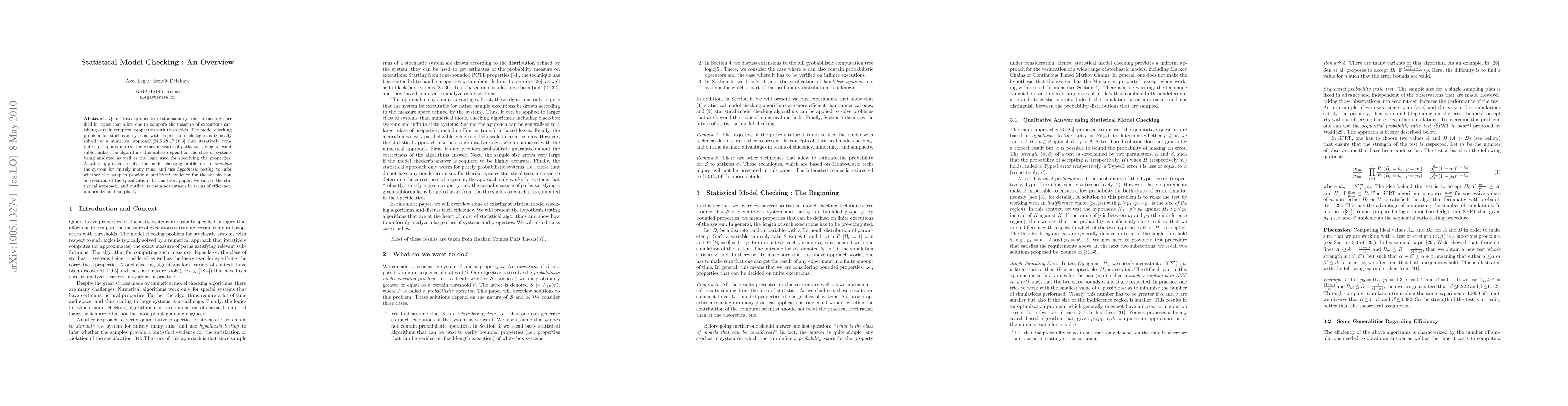 The paper surveys the statistical approach for solving the model checking problem in stochastic systems, contrasting it with numerical approaches. It outlines advantages such as efficiency, uniformity, and simplicity.