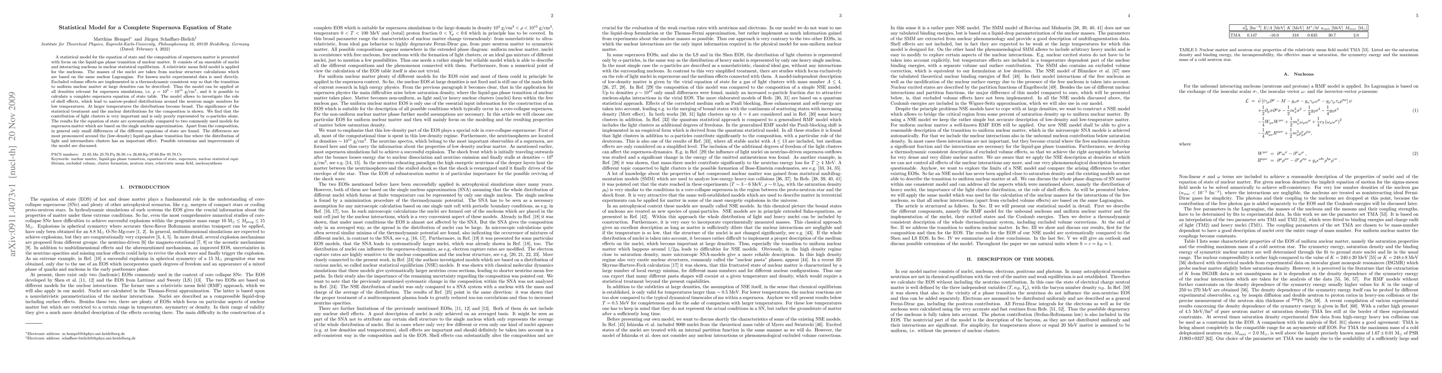 A statistical model for the equation of state (EOS) and the composition of supernova matter is presented with focus on the liquid-gas phase transition of nuclear matter. It consists of an ensemble of nuclei and interacting nucleons in nuclear statistical equilibrium. A relativistic mean field model is applied for the nucleons. The masses of the nuclei are taken from nuclear structure calculations which are based on the same nuclear Lagrangian. For known nuclei experimental data is used directly. Excluded volume effects are implemented in a thermodynamic consistent way so that the transition to uniform nuclear matter at large densities can be described. Thus the model can be applied at all densities relevant for supernova simulations, i.e. rho=10^5 - 10^15 g/cm^3, and it is possible to calculate a complete supernova EOS table. The model allows to investigate the role of shell effects, which lead to narrow-peaked distributions around the neutron magic numbers for low temperatures. At larger temperatures the distributions become broad. The significance of the statistical treatment and the nuclear distributions for the composition is shown. We find that the contribution of light clusters is very important and is only poorly represented by alpha-particles alone. The results for the EOS are systematically compared to two commonly used models for supernova matter which are based on the single nucleus approximation. Apart from the composition, in general only small differences of the different EOSs are found. The differences are most pronounced around the (low-density) liquid-gas phase transition line where the distribution of light and intermediate clusters has an important effect. Possible extensions and improvements of the model are discussed.