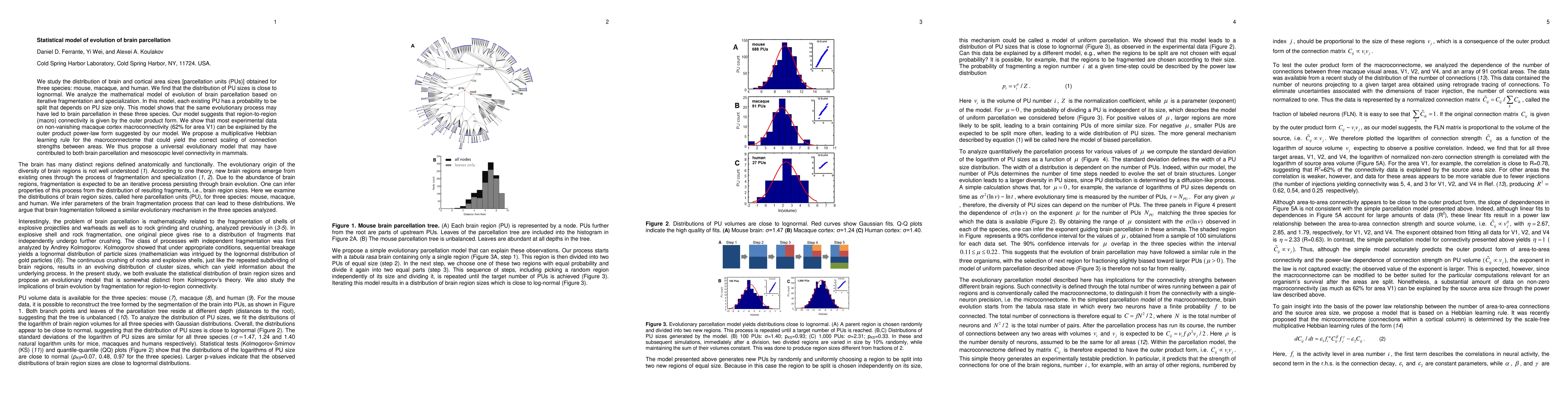 A study found that brain parcellation in mice, macaques, and humans follows a lognormal distribution and suggests a universal evolutionary model for brain development and connectivity. The model predicts a power-law form of region-to-region connectivity and proposes a new learning rule for the macroconnectome.