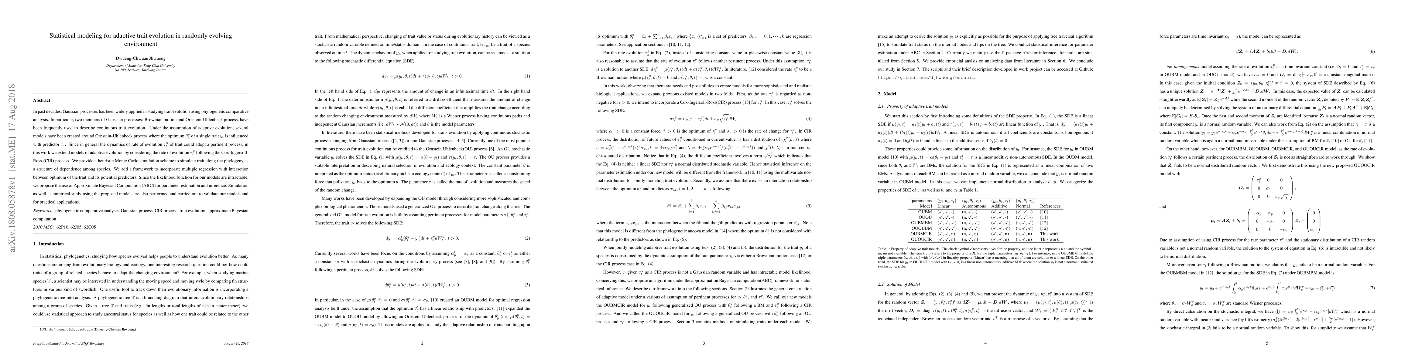 In past decades, Gaussian processes has been widely applied in studying trait evolution using phylogenetic comparative analysis. In particular, two members of Gaussian processes: Brownian motion and Ornstein-Uhlenbeck process, have been frequently used to describe continuous trait evolution. Under the assumption of adaptive evolution, several models have been created around Ornstein-Uhlenbeck process where the optimum $\theta^y_t$ of a single trait $y_t$ is influenced with predictor $x_t$. Since in general the dynamics of rate of evolution $\tau^y_t$ of trait could adopt a pertinent process, in this work we extend models of adaptive evolution by considering the rate of evolution $\tau_t^y$ following the Cox-Ingersoll-Ross (CIR) process. We provide a heuristic Monte Carlo simulation scheme to simulate trait along the phylogeny as a structure of dependence among species. We add a framework to incorporate multiple regression with interaction between optimum of the trait and its potential predictors. Since the likelihood function for our models are intractable, we propose the use of Approximate Bayesian Computation (ABC) for parameter estimation and inference. Simulation as well as empirical study using the proposed models are also performed and carried out to validate our models and for practical applications.