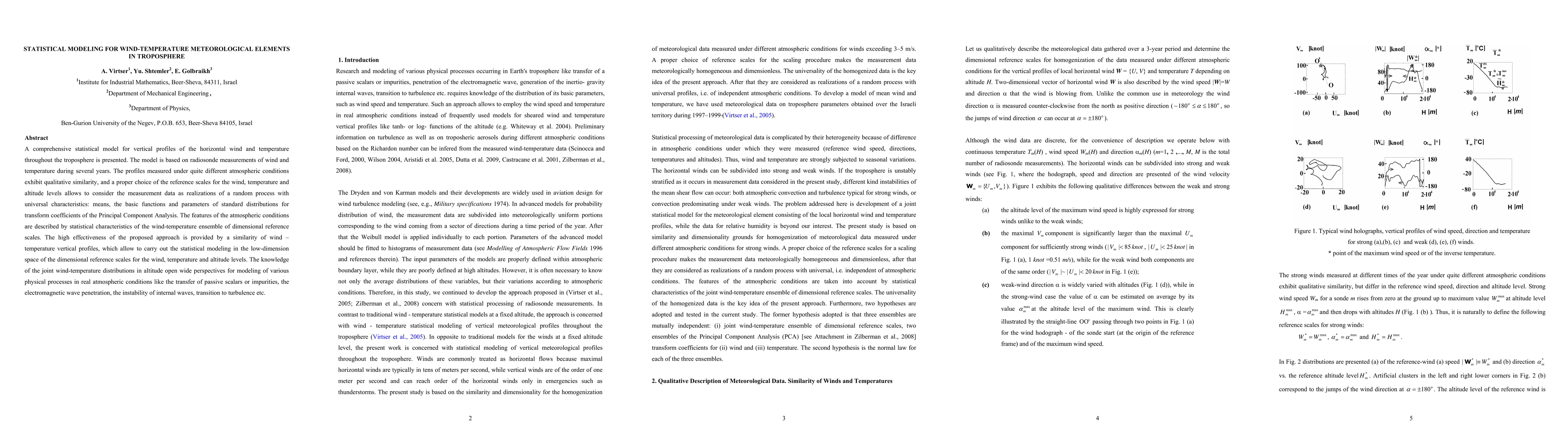 A statistical model for wind-temperature profiles in the troposphere is proposed, using radiosonde data to create a universal model that captures atmospheric conditions. This model has implications for modeling various physical processes in real atmospheric conditions, such as air pollution and electromagnetic wave penetration.