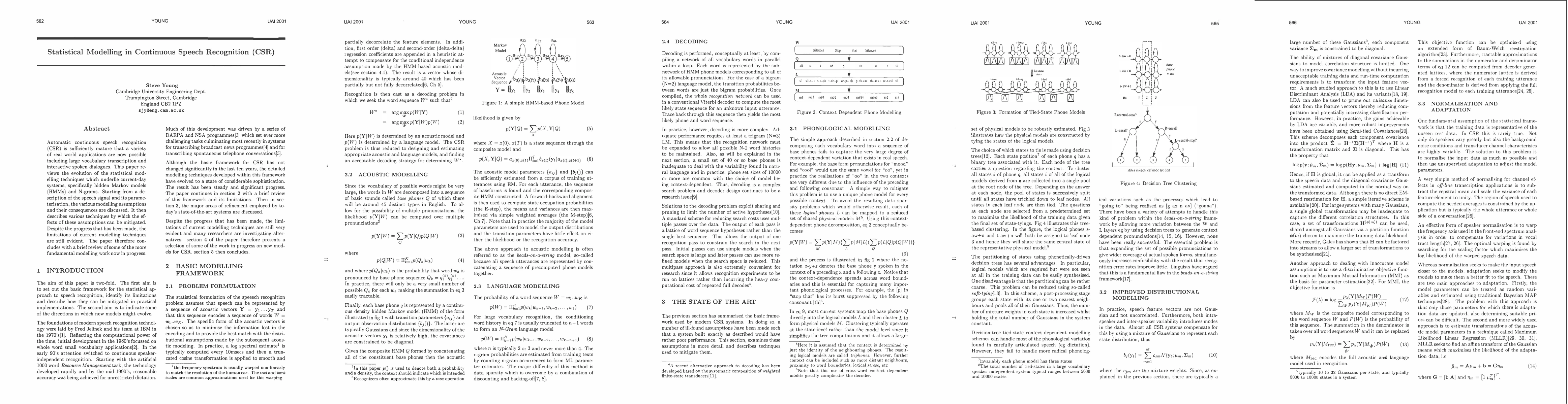 Automatic continuous speech recognition (CSR) is sufficiently mature that a variety of real world applications are now possible including large vocabulary transcription and interactive spoken dialogues. This paper reviews the evolution of the statistical modelling techniques which underlie current-day systems, specifically hidden Markov models (HMMs) and N-grams. Starting from a description of the speech signal and its parameterisation, the various modelling assumptions and their consequences are discussed. It then describes various techniques by which the effects of these assumptions can be mitigated. Despite the progress that has been made, the limitations of current modelling techniques are still evident. The paper therefore concludes with a brief review of some of the more fundamental modelling work now in progress.