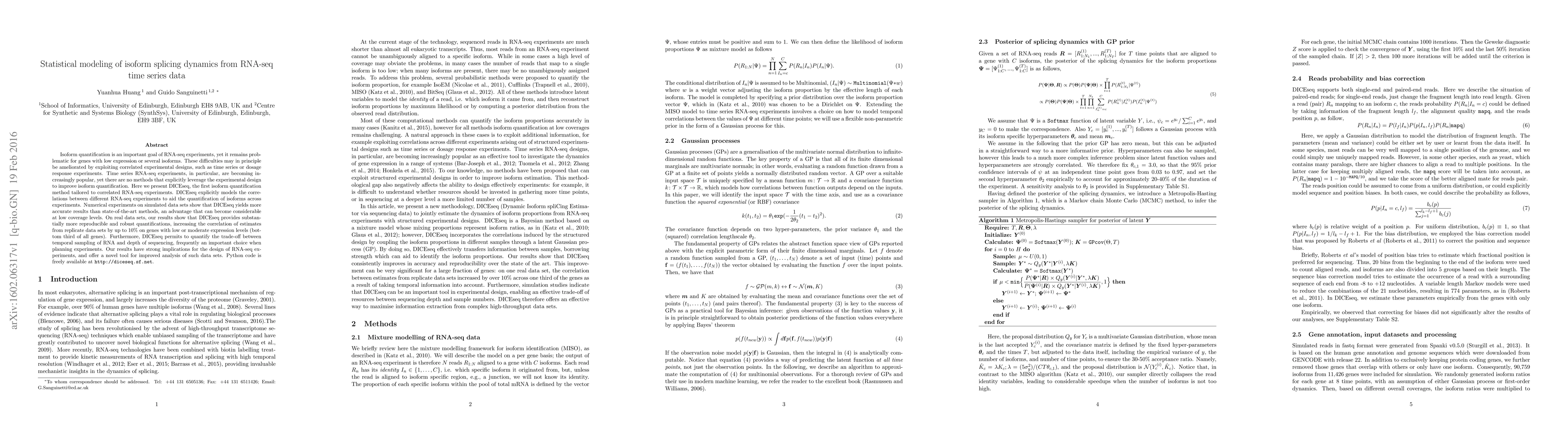 DICEseq is the first isoform quantification method tailored to correlated RNA-seq experiments, explicitly modeling correlations between different RNA-seq experiments to aid isoform quantification across experiments using Gaussian processes.