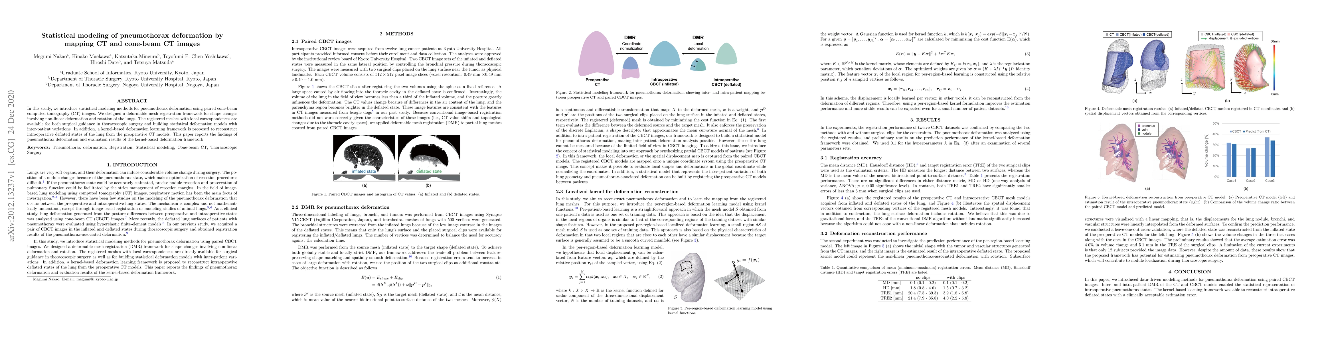 In this study, we introduce statistical modeling methods for pneumothorax deformation using paired cone-beam computed tomography (CT) images. We designed a deformable mesh registration framework for shape changes involving non-linear deformation and rotation of the lungs. The registered meshes with local correspondences are available for both surgical guidance in thoracoscopic surgery and building statistical deformation models with inter-patient variations. In addition, a kernel-based deformation learning framework is proposed to reconstruct intraoperative deflated states of the lung from the preoperative CT models. This paper reports the findings of pneumothorax deformation and evaluation results of the kernel-based deformation framework.
