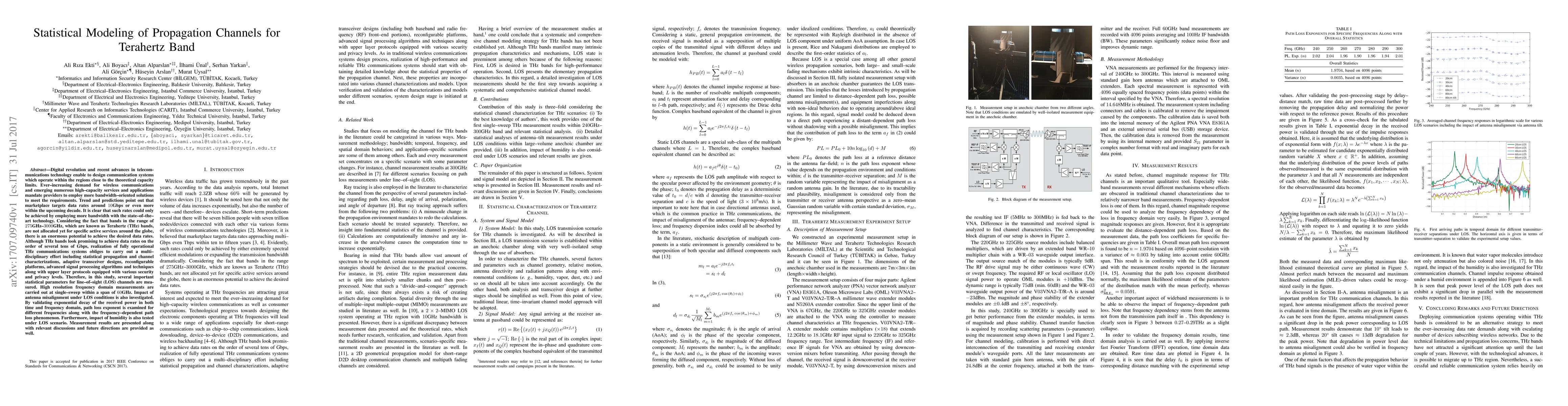 Digital revolution and recent advances in telecommunications technology enable to design communication systems which operate within the regions close to the theoretical capacity limits. Ever-increasing demand for wireless communications and emerging numerous high-capacity services, data rates and applications mandate providers to employ more bandwidth-oriented solutions to meet the requirements. It is clear that such rates could only be achieved by employing more bandwidth with the state-of-the- art technology. Considering the fact that bands in the range of 275GHz-3000GHz, which are known as Terahertz (THz) bands, are not allocated yet for specific active services around the globe, there is an enormous potential to achieve the desired data rates. Although THz bands look promising to achieve data rates on the order of several tens of Gbps, realization of fully operational THz communications systems obliges to carry out a multi- disciplinary effort including statistical propagation and channel characterizations, adaptive transceiver designs, reconfigurable platforms, advanced signal processing algorithms and techniques along with upper layer protocols equipped with various security and privacy levels. Therefore, in this study, several important statistical parameters for line-of-sight (LOS) channels are measured. High resolution frequency domain measurements are carried out at single-sweep within a span of 60GHz. Impact of antenna misalignment under LOS conditions is also investigated. By validating exponential decay of the received power in both time and frequency domain, path loss exponent is examined for different frequencies along with the frequency-dependent path loss phenomenon. Furthermore, impact of humidity is also tested under LOS scenario. Measurement results are presented along with relevant discussions and future directions are provided as well.