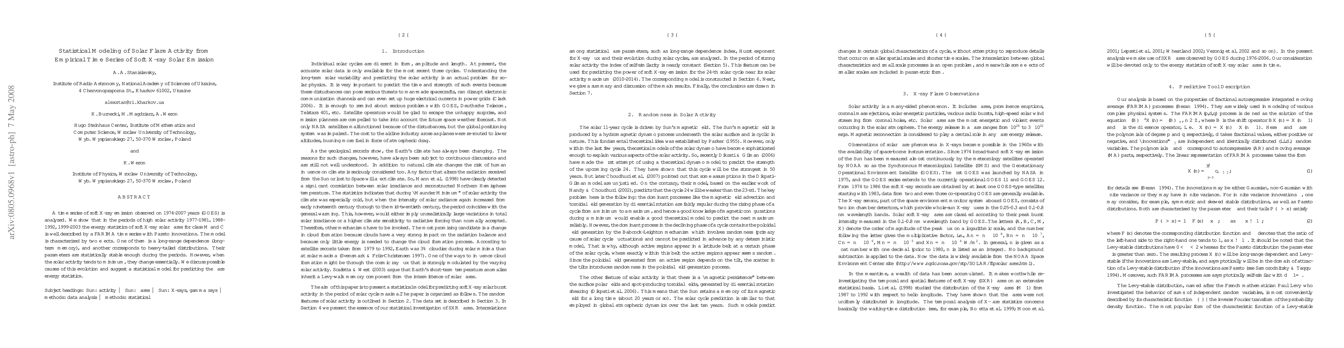 This paper analyzes soft X-ray solar flare activity from 1974-2007 using a FARIMA time series model with Pareto innovations, revealing long-range dependence and heavy-tailed distributions during high solar activity periods. The model parameters change significantly during low solar activity, prompting a discussion on underlying causes and a predictive statistical model.