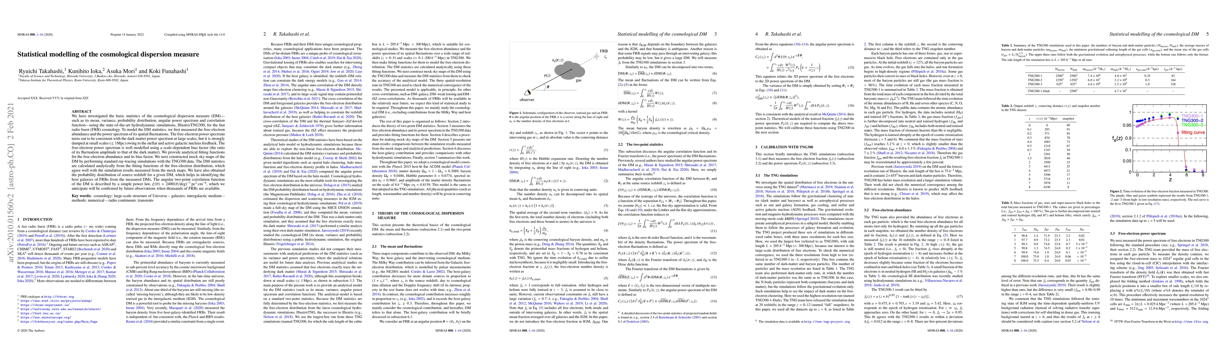 This paper investigates the statistical properties of the cosmological dispersion measure (DM) using advanced hydrodynamic simulations, focusing on mean, variance, and probability distribution. It models the DM using a scale-dependent bias factor and provides fitting functions for free-electron abundance and bias, which align well with simulation results.