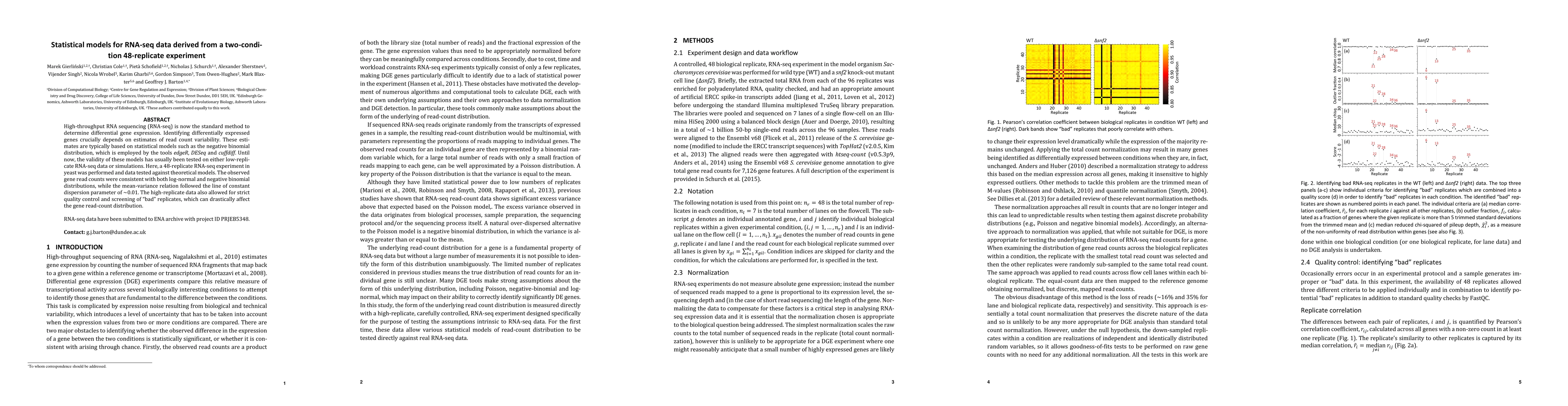 This paper evaluates the performance of statistical models for RNA-seq data using a high-replicate two-condition experiment in yeast, finding that observed gene read counts align well with log-normal and negative binomial distributions, while highlighting the importance of quality control in such large datasets.