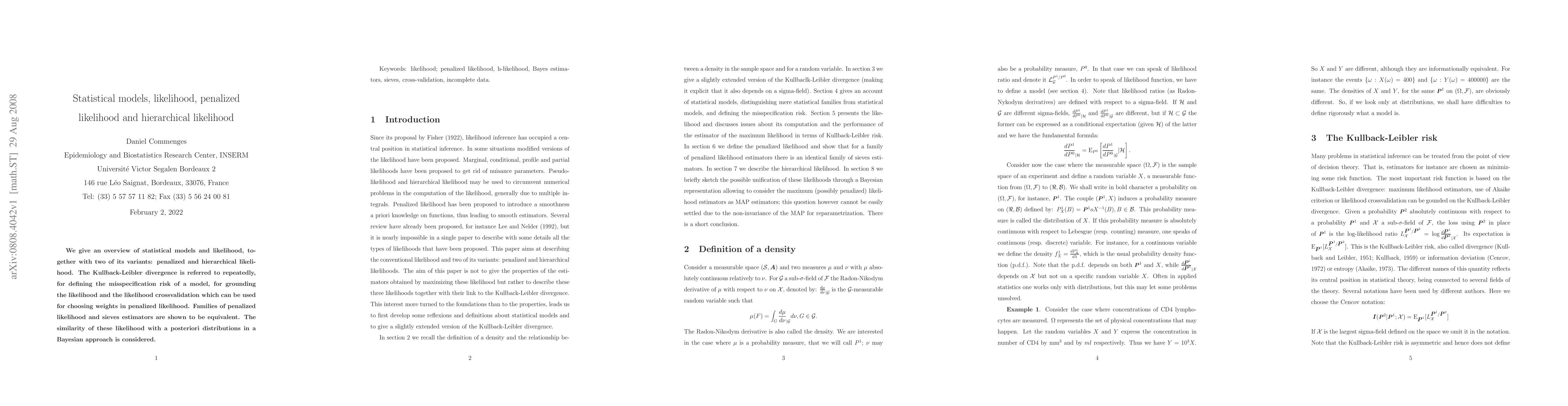 This paper provides an overview of statistical models and likelihood, exploring penalized and hierarchical likelihood, with a focus on the Kullback-Leibler divergence for defining misspecification risk and model selection. It demonstrates the equivalence of penalized likelihood and sieves estimators and discusses their Bayesian approach similarities.