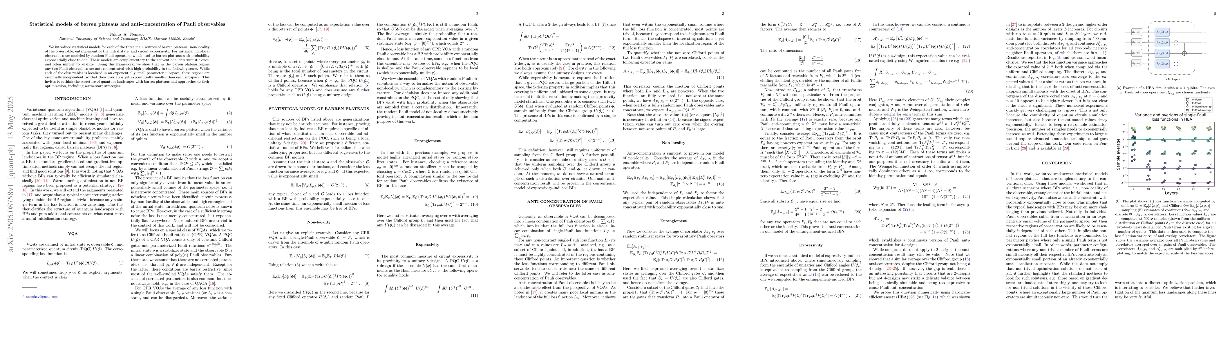 The introduction of statistical models for barren plateau sources and demonstration of anti-concentration of Pauli observables under these models.
