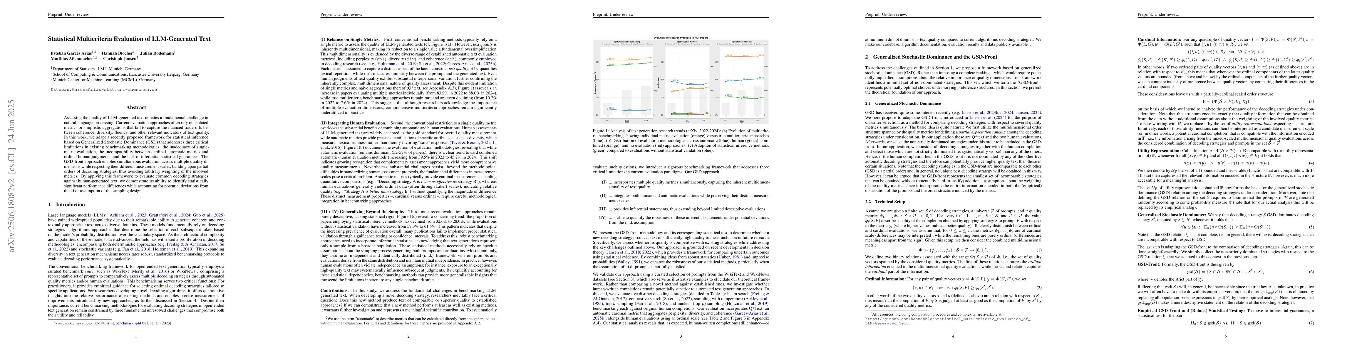 Assessing the quality of LLM-generated text remains a fundamental challenge in natural language processing. Current evaluation approaches often rely on isolated metrics or simplistic aggregations that fail to capture the nuanced trade-offs between coherence, diversity, fluency, and other relevant indicators of text quality. In this work, we adapt a recently proposed framework for statistical inference based on Generalized Stochastic Dominance (GSD) that addresses three critical limitations in existing benchmarking methodologies: the inadequacy of single-metric evaluation, the incompatibility between cardinal automatic metrics and ordinal human judgments, and the lack of inferential statistical guarantees. The GSD-front approach enables simultaneous evaluation across multiple quality dimensions while respecting their different measurement scales, building upon partial orders of decoding strategies, thus avoiding arbitrary weighting of the involved metrics. By applying this framework to evaluate common decoding strategies against human-generated text, we demonstrate its ability to identify statistically significant performance differences while accounting for potential deviations from the i.i.d. assumption of the sampling design.