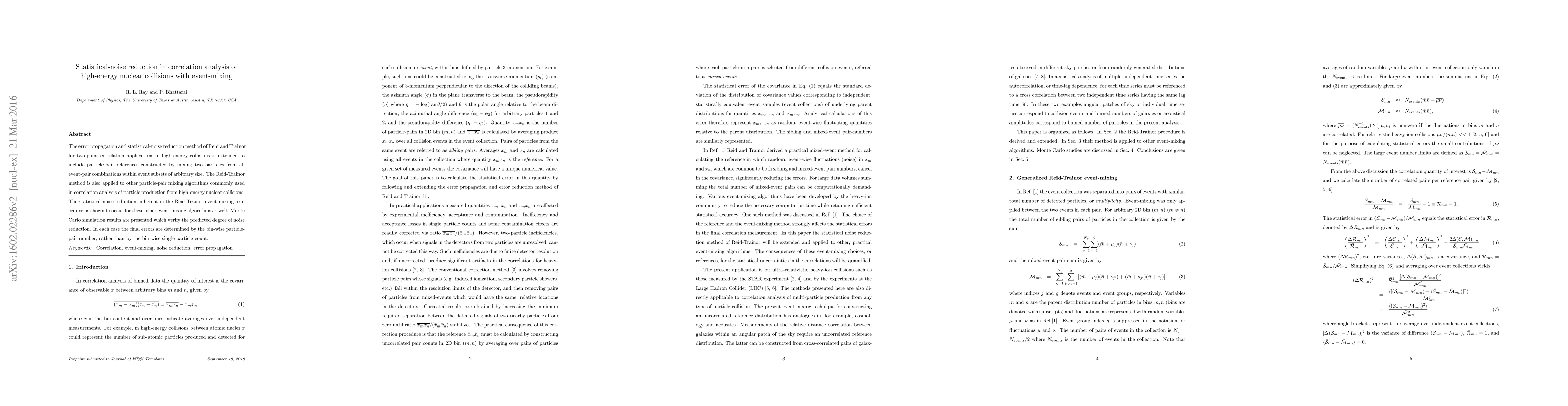 The error propagation and statistical-noise reduction method of Reid and Trainor for two-point correlation applications in high-energy collisions is extended to include particle-pair references constructed by mixing two particles from all event-pair combinations within event subsets of arbitrary size. The Reid-Trainor method is also applied to other particle-pair mixing algorithms commonly used in correlation analysis of particle production from high-energy nuclear collisions. The statistical-noise reduction, inherent in the Reid-Trainor event-mixing procedure, is shown to occur for these other event-mixing algorithms as well. Monte Carlo simulation results are presented which verify the predicted degree of noise reduction. In each case the final errors are determined by the bin-wise particle-pair number, rather than by the bin-wise single-particle count.